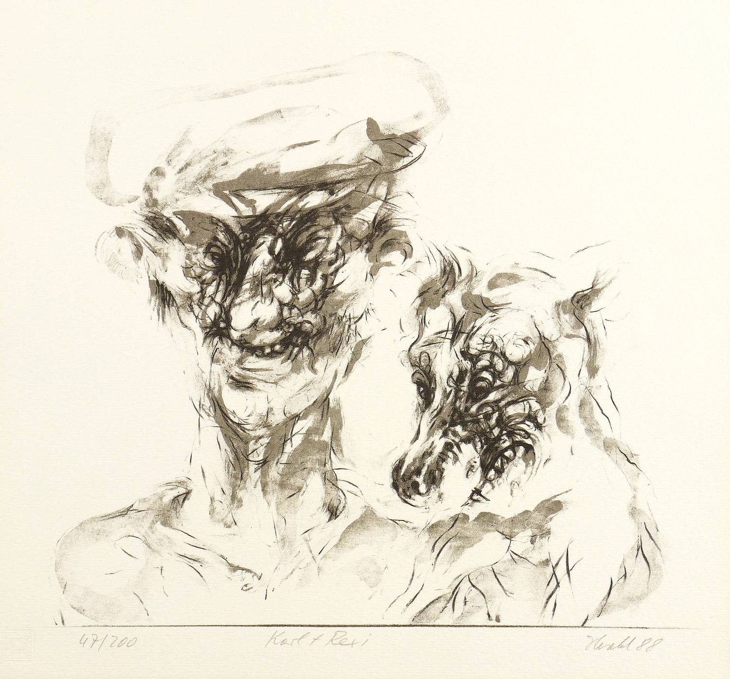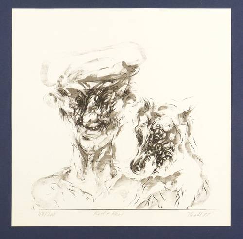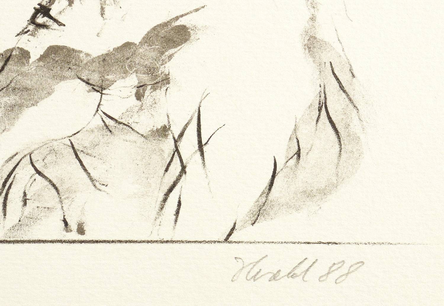 1988. Farblithografie / Pinsellithografie, in 2 Farben, auf hellgelbem hartem Maschinenbütten. – Von Rainer Herold. – Auflage Exemplar Nr. 47/200. – 27,7 x 31,5 cm (Darstellung), 36 x 36 cm (Blatt).