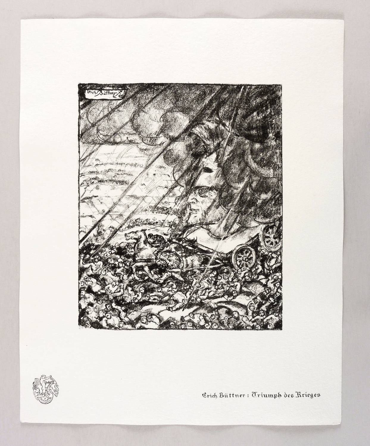 Aus: Krieg und Kunst. Original-Steinzeichnungen der Berliner Sezession (Berlin: Julius Bard 1915). – Nicht handsigniert. Im Stein links oben im Schriftband signiert: ″Erich Büttner″. Im Blattrand rechts unten typografisch bezeichnet und betitelt: ″Erich Büttner: Triumph des Krieges″. Links unten Vignette der Berliner Sezession. – Originalrandiges Exemplar. Sehr guter Zustand.