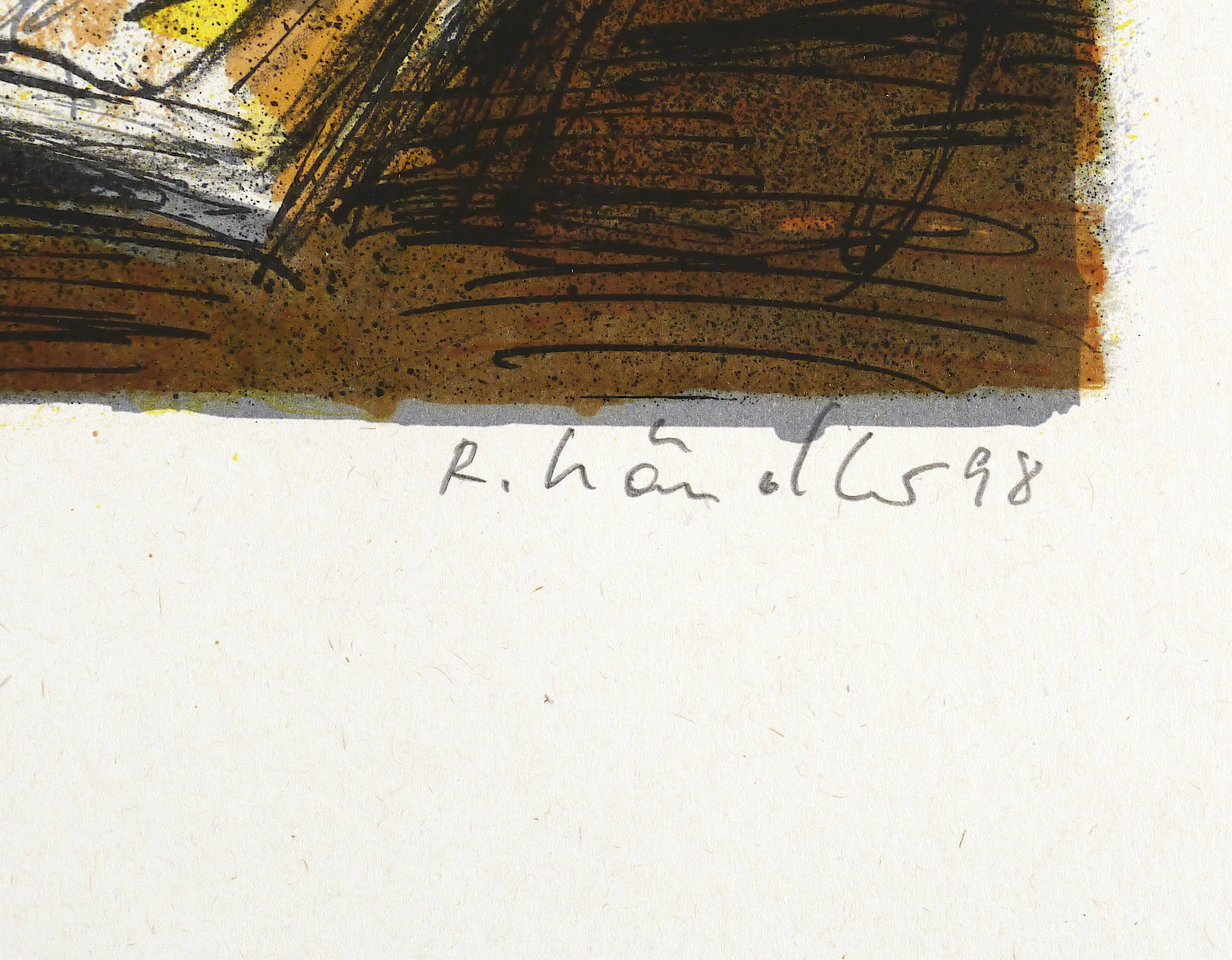 1998. Farblithografie / Pinsellithografie, partiell gespritzt, in 5 Farben, auf hartem hellem Velinkarton. – Originale Künstlergrafik, von Rolf Händler. – Auflage 300 Exemplare. – 27,4 x 29,9 cm (Darstellung / Druckbild), 45 x 35 cm (Blatt).