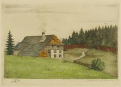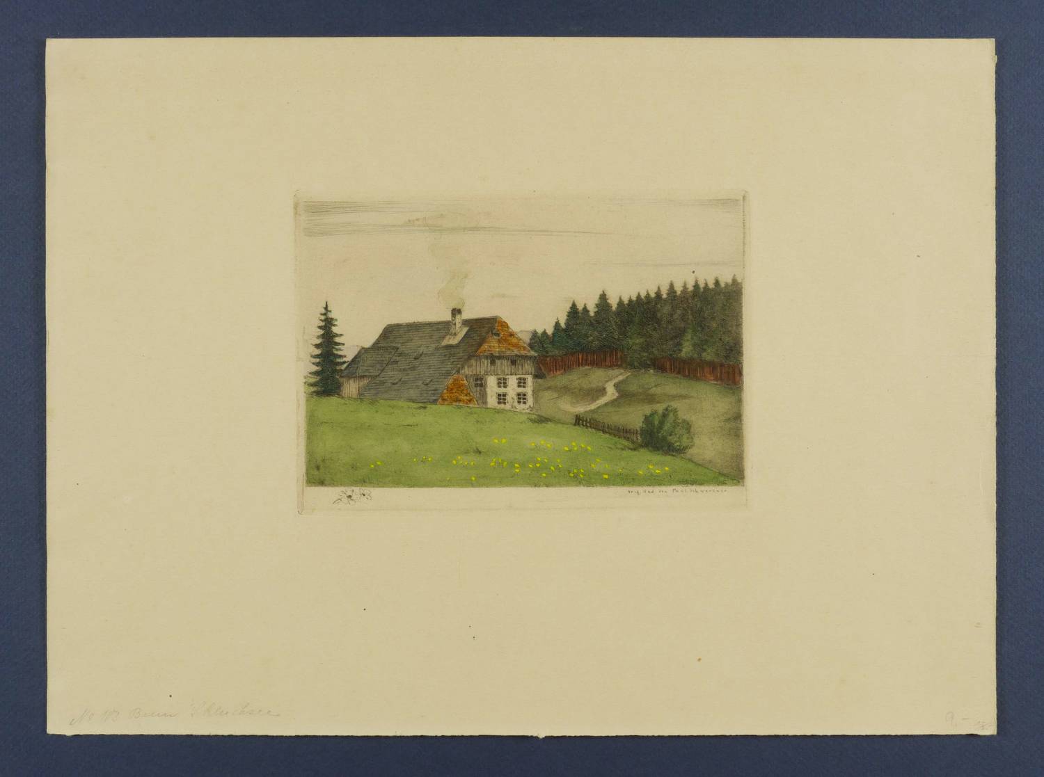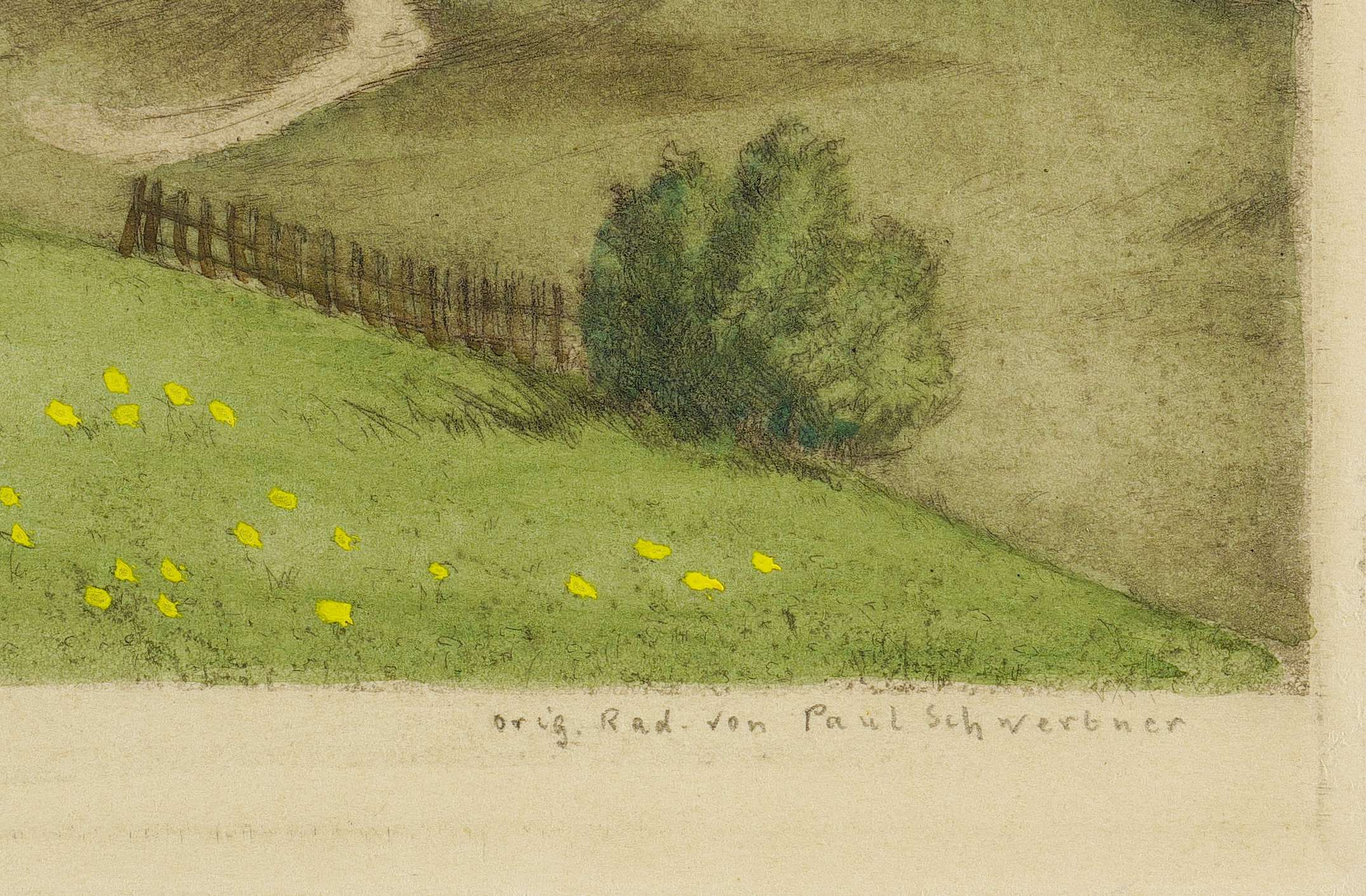 Um 1940. Radierung / Strichätzung & Kaltnadel, aquarelliert, partiell gouachiert, auf Kupferdruckpapier. – Originale Künstlergrafik, von Paul Schwertner. – 11,5 x 16,2 cm (Darstellung / Platte), 25 x 34 cm (Blatt).