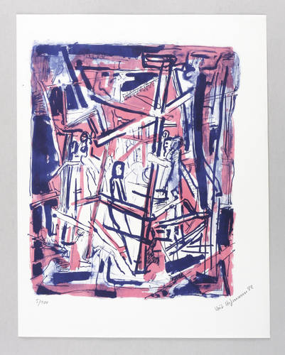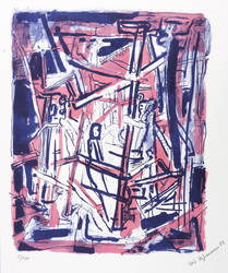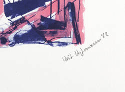 1982. Farblithografie / Kreidelithografie, in Hellrot & Blauschwarz, auf leichtem Maschinenbütten. – Originale Künstlergrafik, von Veit Hofmann. – Auflage Exemplar Nr. 5/100. – 35,2 x 28,5 cm (Darstellung / Druckbild), 44 x 35 cm (Blatt).