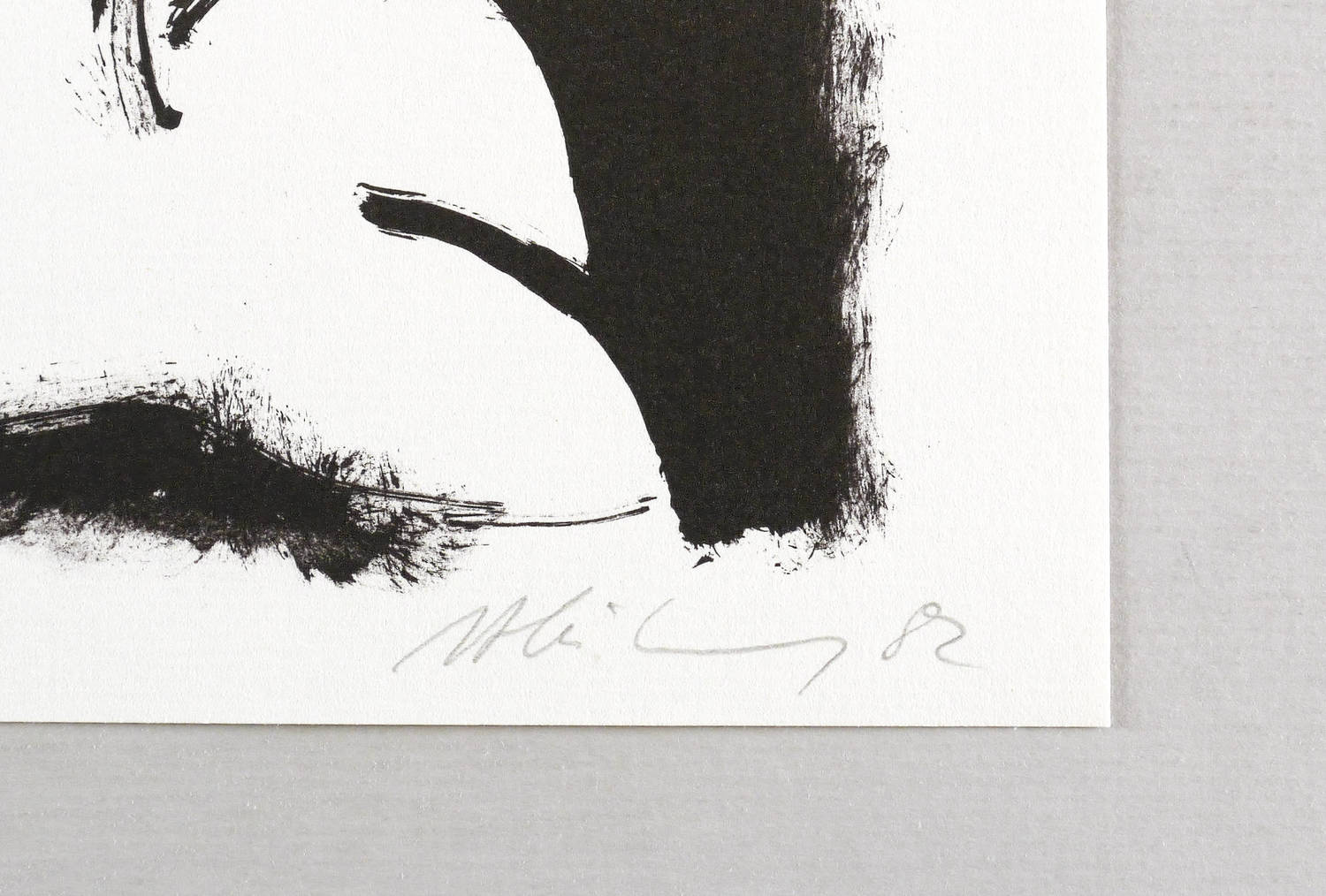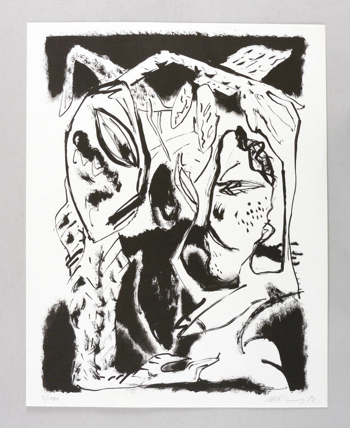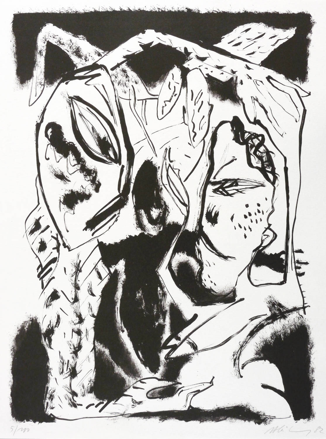 1982. Offsetlithografie / Pinsellithografie, in Schwarz, auf leichtem weißem Maschinenbütten. – Originale Künstlergrafik, von Helge Leiberg. – Auflage Exemplar Nr. 5/100. – 44 x 35 cm (Blatt), 41,1 x 30,6 cm (Darstellung / Druckbild).