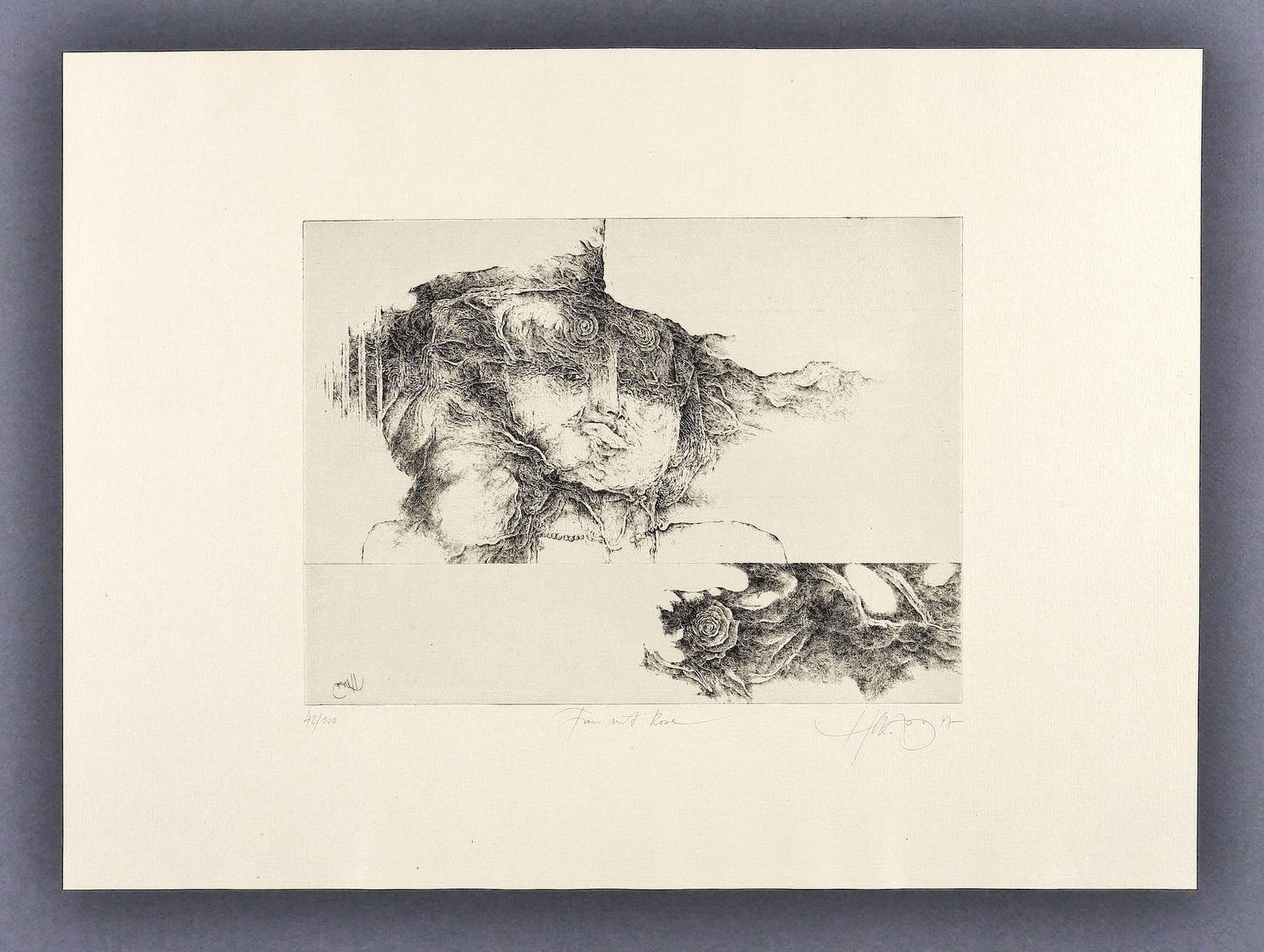 1977. Radierung / Strichätzung, in Schwarz, mit leichtem Plattenton, auf hellchamois Velin. – Originale Künstlergrafik, von Walter Herzog. – Auflage Exemplar Nr. 42/100. – 20,5 x 27,8 cm (Darstellung / Platte), 36 x 48 cm (Blatt).