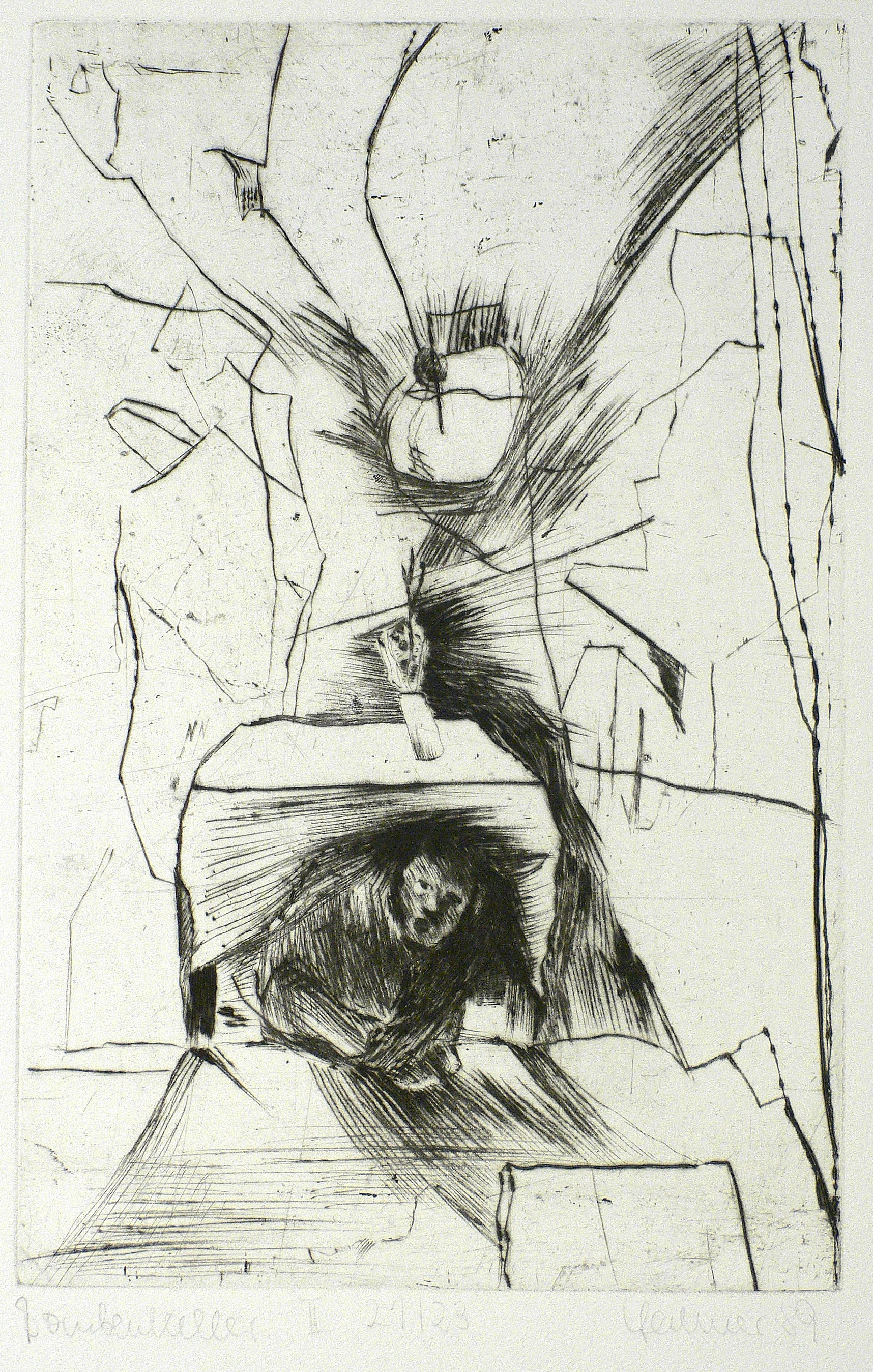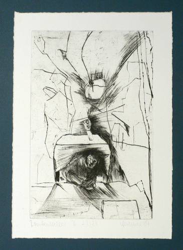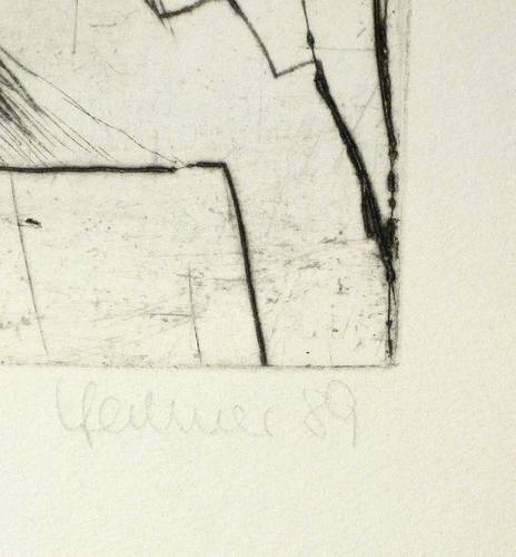 1989. Radierung / Kaltnadel, in Schwarz, auf hellchamois Velin. – Originale Künstlergrafik, von Barbara Lechner. – Auflage Exemplar Nr. 21/23. – 24,8 x 16,1 cm (Darstellung / Platte), 30 x 21 cm (Blatt).