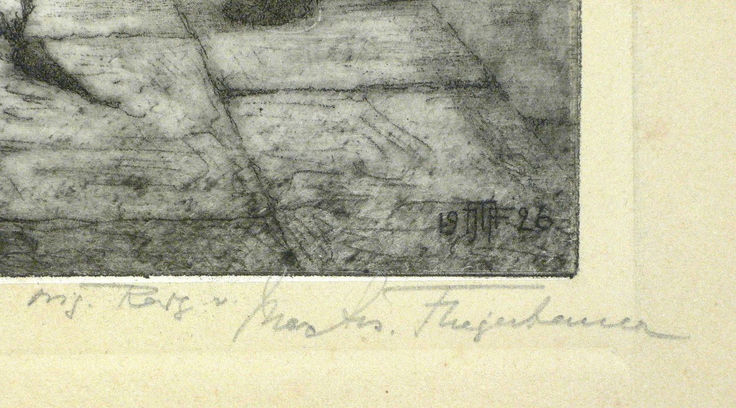 Rechts unten in Bleistift signiert. Dazu bezeichnet: ″orig. Rad.″ Links Titel. In der Platte rechts unten monogrammiert und datiert. Außerhalb der Platte Prägestempel ″Orig.-Radg.″ unten links und Prägestempel mit Monogramm ″MJF″ unten mittig. – Blattrand etwas stockfleckig und knickspurig, altersbedingt leicht gebräunt. Dennoch insgesamt gut erhalten.