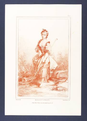 Aus: Emile Wattier, L'oeuvre de Boucher reproduit par Émile Wattier d'après la gravure des dessins originaux (Paris: Fabre 1884). – Im Stein rechts unten signiert: "Emile Wattier del." Links bezeichnet: "Boucher Inv." Mittig Druckeradresse von Lemercier et Cie. in Paris. Darunter Verlagsadresse. – Im Blattrand rechts kaum merklich fleckig. Sonst gut erhalten.