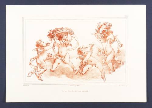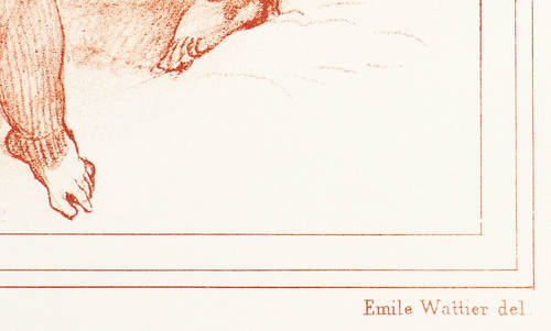 Aus: Emile Wattier, L'oeuvre de Boucher reproduit par Émile Wattier d'après la gravure des dessins originaux (Paris: Fabre 1884). – Im Stein rechts unten signiert: "Emile Wattier del." Links bezeichnet: "Boucher inv." Mittig Druckeradresse von Lemercier et Cie. in Paris. Darunter Verlagsadresse. – Sehr gut erhalten.