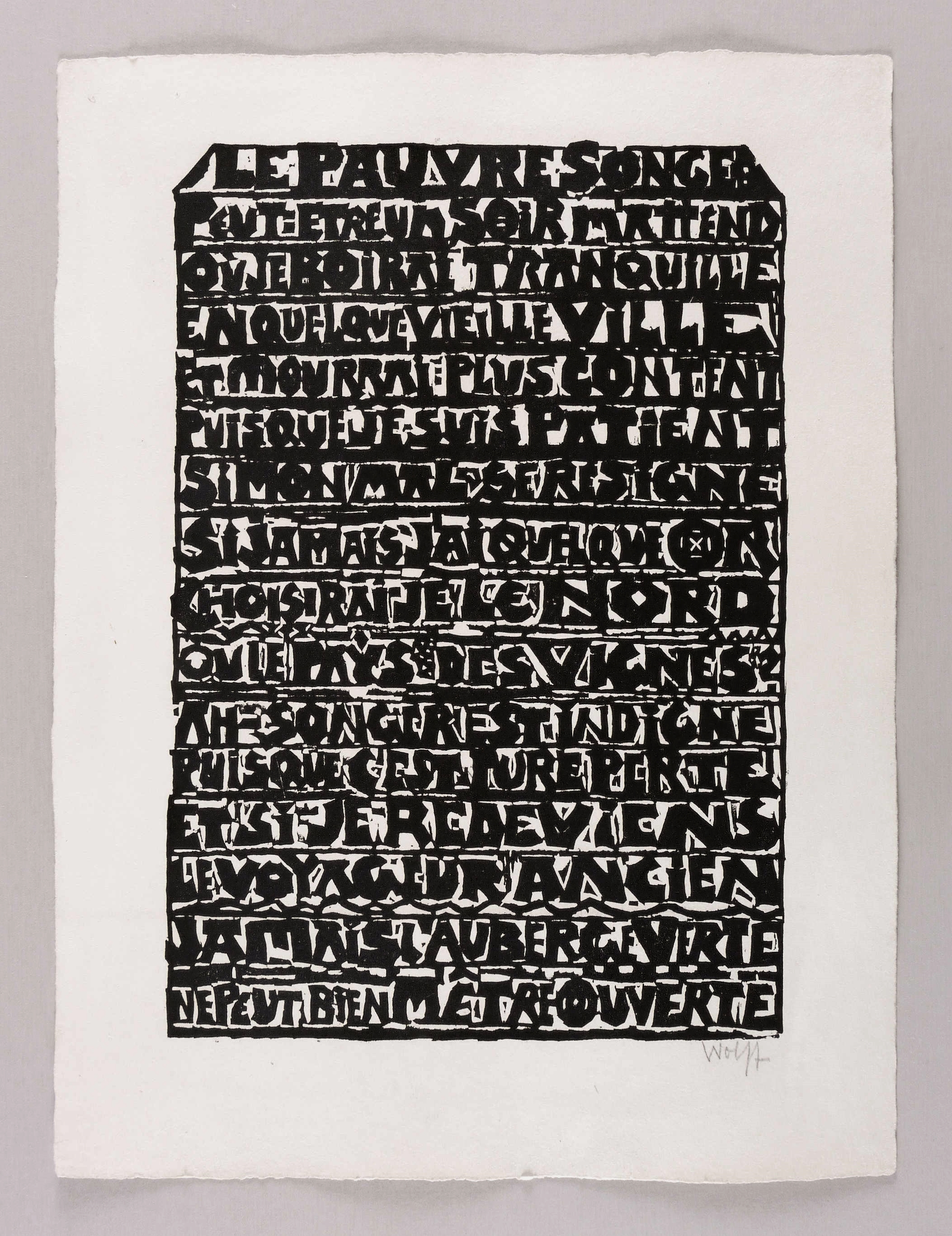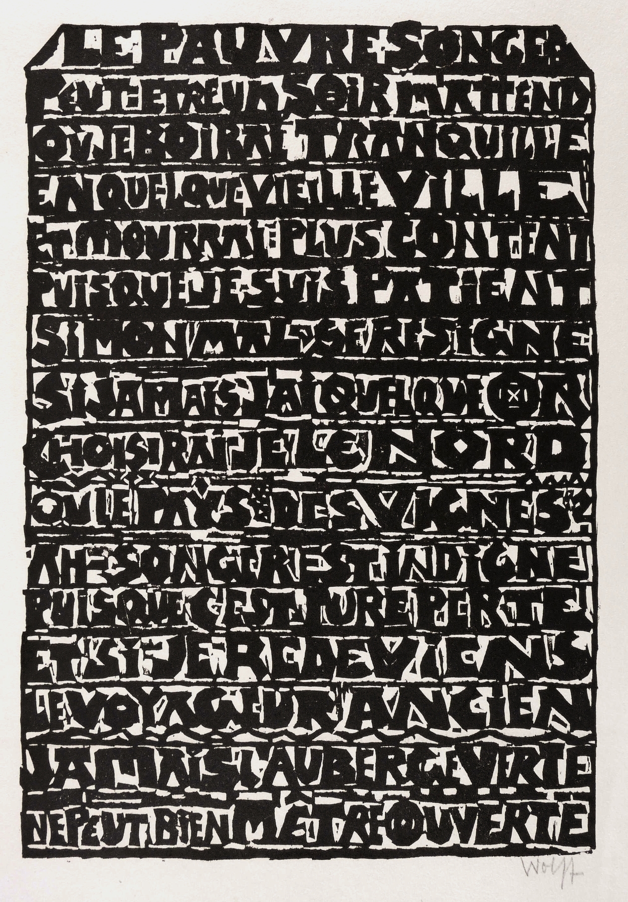 Holthusen 10. Söhn HDO 72713-10. – Aus: Die Schaffenden (Berlin: Euphorion-Verlag 1922/1923), Bd. 4. – Rechts unten in Bleistift signiert: ″Wolff″. – Schriftblatt mit dem Gedicht ″Der arme Träumer (Le pauvre songe)″ von Arthur Rimbaud. - Ein Exemplar von 125 handsignierten Abzügen für den IV. Jahrgang der Mappe ″Die Schaffenden″ (Berlin: Euphorion-Verlag 1922/1923). – Unbeschnittenes originalrandiges Exemplar. Unscheinbare Lagerspuren. Guter Zustand.