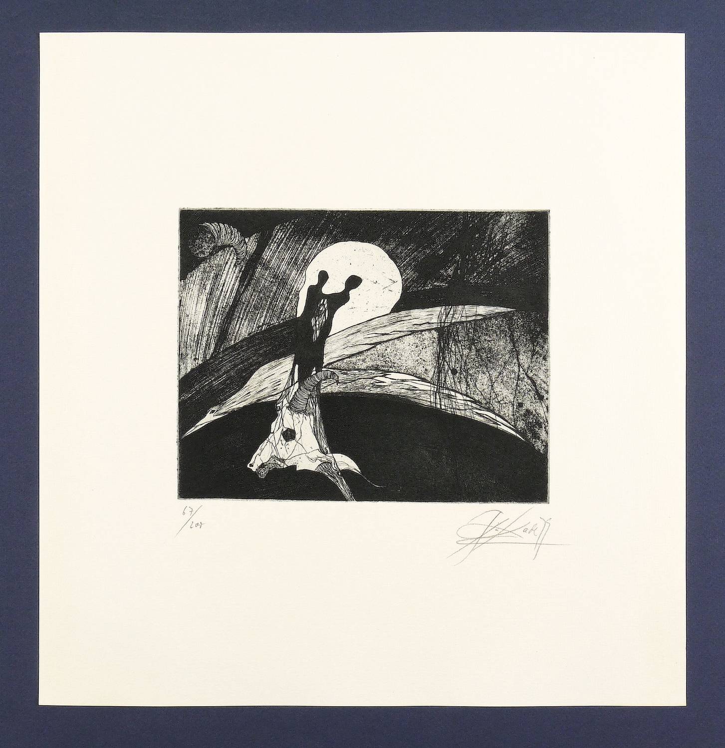 1979. Radierung / Strichätzung & Reservage, in Schwarz, auf hellem Büttenpapier. – Originale Künstlergrafik, von Gregor Torsten Kozik. – Auflage Exemplar Nr. 67/200. – 15,9 x 20,2 cm (Darstellung / Platte), 37 x 35 cm (Blatt).