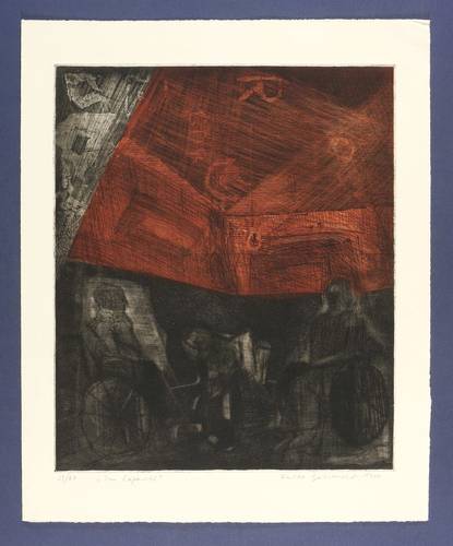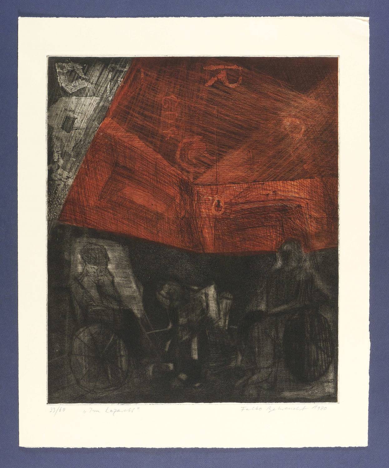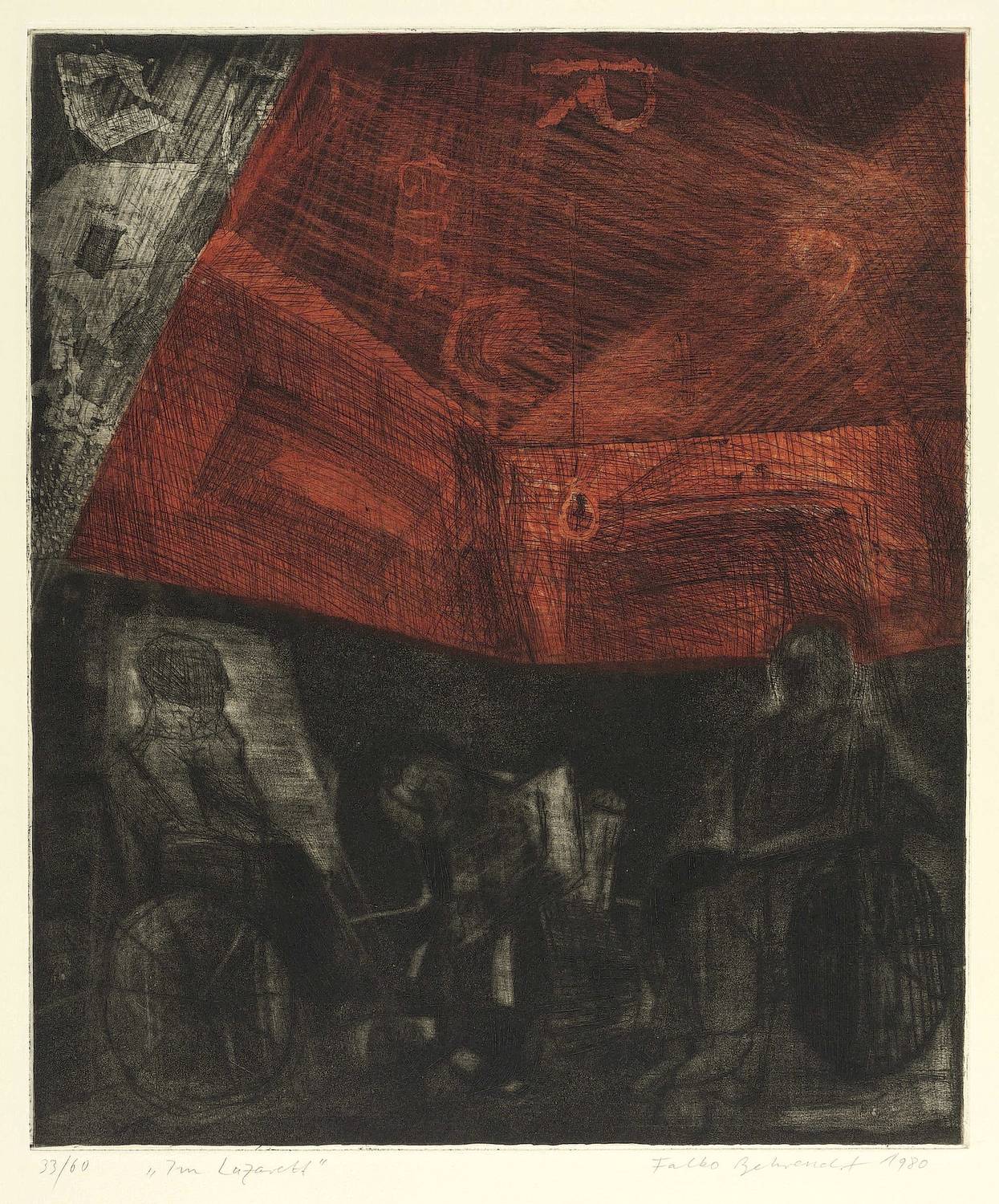 1980. Farbradierung / Strichätzung, Kaltnadel & Aquatinta, in Rot & Schwarz, auf gelblichem Büttenpapier. – Originale Künstlergrafik, von Falko Behrendt. – Auflage Exemplar Nr. 33/60. – 44,8 x 37,7 cm (Darstellung / Platte), 55,5 x 45 cm (Blatt).