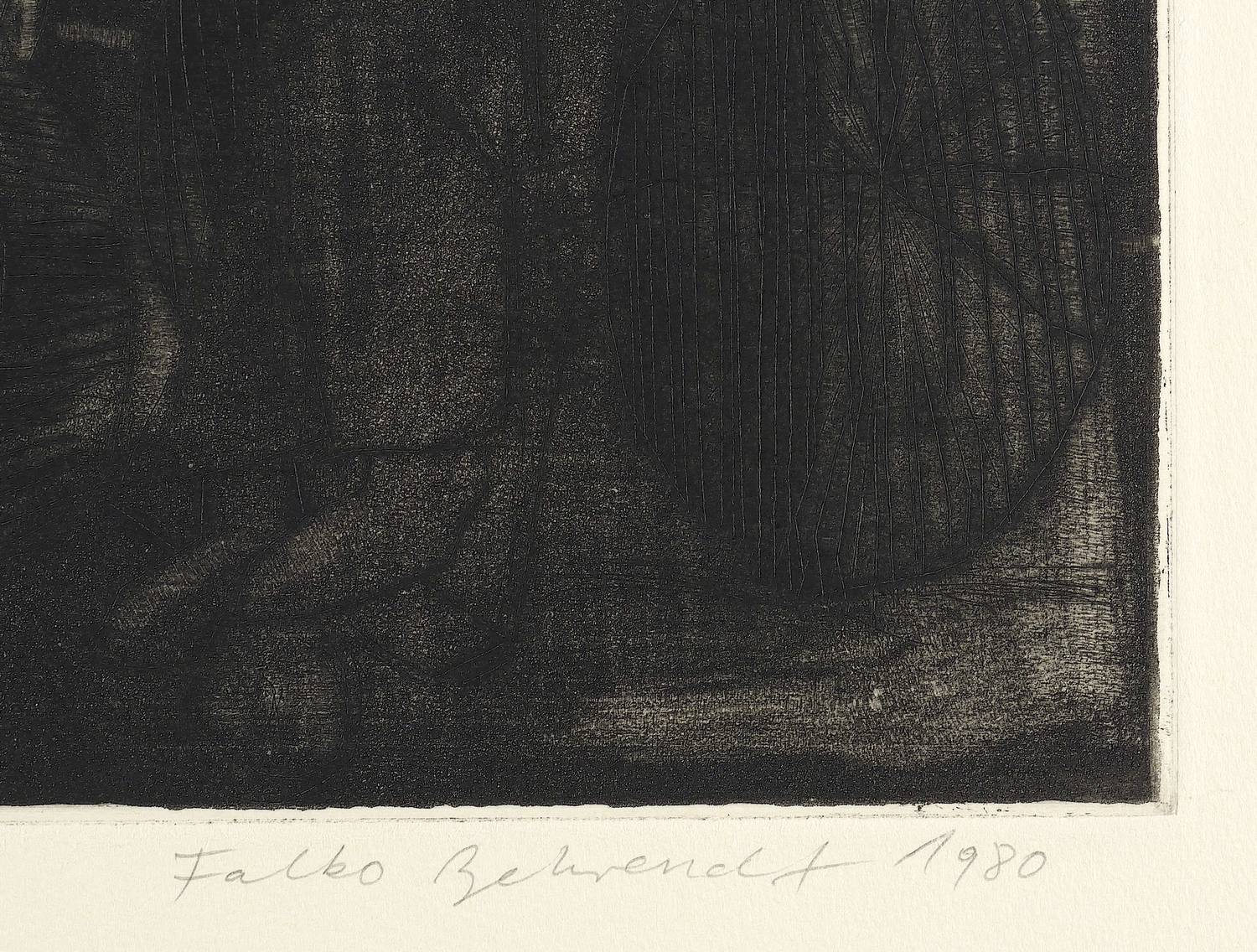 Falko Behrendt (*1951 Torgelow, lebt und arbeitet in Lübeck). Deutscher Maler und Grafiker. 1971-75 Studium an der Hochschule für bildende Künste Dresden bei Professor Günter Horlbeck und Professor Gerhard Kettner. Ab 1975 als freischaffender Künstler in Neubrandenburg tätig. 1977-90 Mitglied im Verband Bildender Künstler der DDR, dort Mitglied der Zentralen Grafikgruppe. 1978 Preis "Junge Künstler der DDR". 1977/78, 1982/83 und 1987/88 Teilnahme an den Kunstausstellungen der DDR in Dresden. 1980 Palästina-Reise als Abgesandter des VBK mit Edmund Bechtle, Uwe Bullmann, Christian Heinze und Günther Rechn. 1982 Beginn der Beschäftigung mit Fotografik, einer Kombination aus Fotografie und Grafik. 1989 Intensive Beschäftigung mit Übermalungen von Radierungen und Lithographien. Arbeitsstipendien: 1990 Dr.-Hans-Hoch-Stiftung in Neumünster, 1991 Kulturstiftung Nordrhein-Westfalen. Seit 1991 Wohnung und Atelier in Lübeck. 2001 umfangreiche Werkpräsentation zum 50. Geburtstag in der Kunstsammlung Neubrandenburg, im Kulturforum Burgkloster zu Lübeck und in der Stadtgalerie im Elbeforum Brunsbüttel. Mitglied im Verein für Original-Radierung.