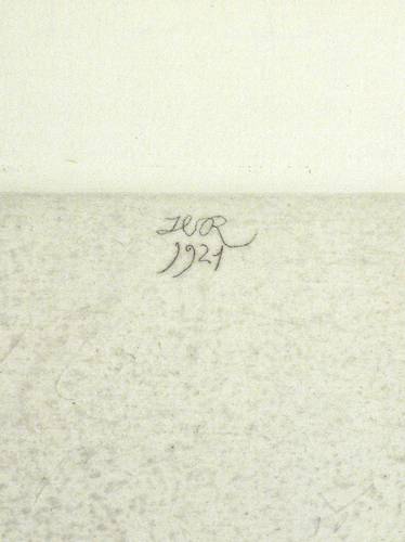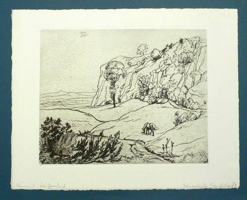 Aus: Die deutsche Graphik (Hamburg & Leipzig: Fichtegesellschaft & R. Voigtländer Verlag 1921-1922), Bd. (1921). – Nicht handsigniert. In der Platte monogrammiert und datiert oben mittig: ″HR / 1921″. Am Blattrand unten in Bleistift von fremder Hand bezeichnet. – Berglandschaft mit Pferd. – Verso Reste einer ehemaligen Montierung. Insgesamt gut erhalten.