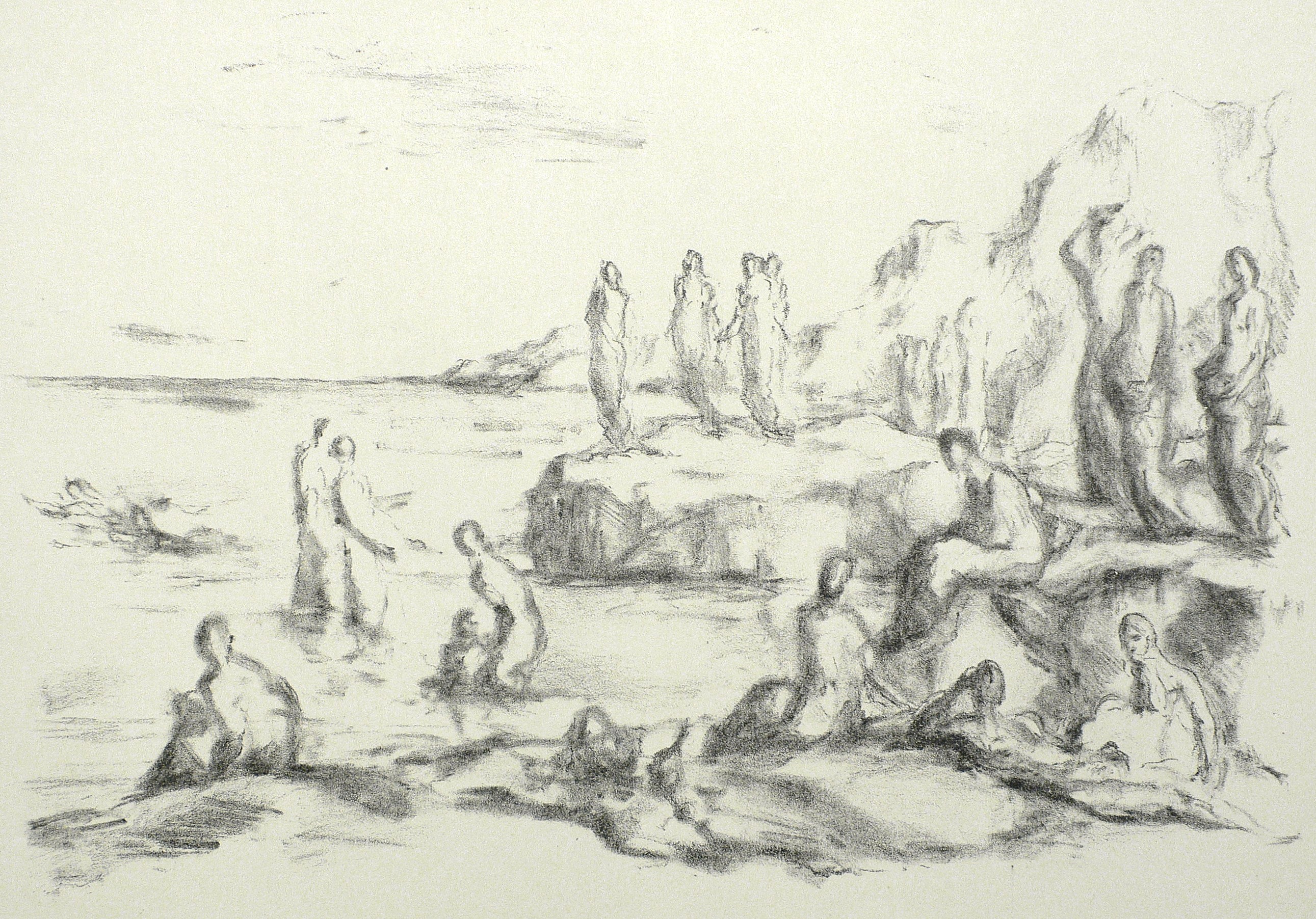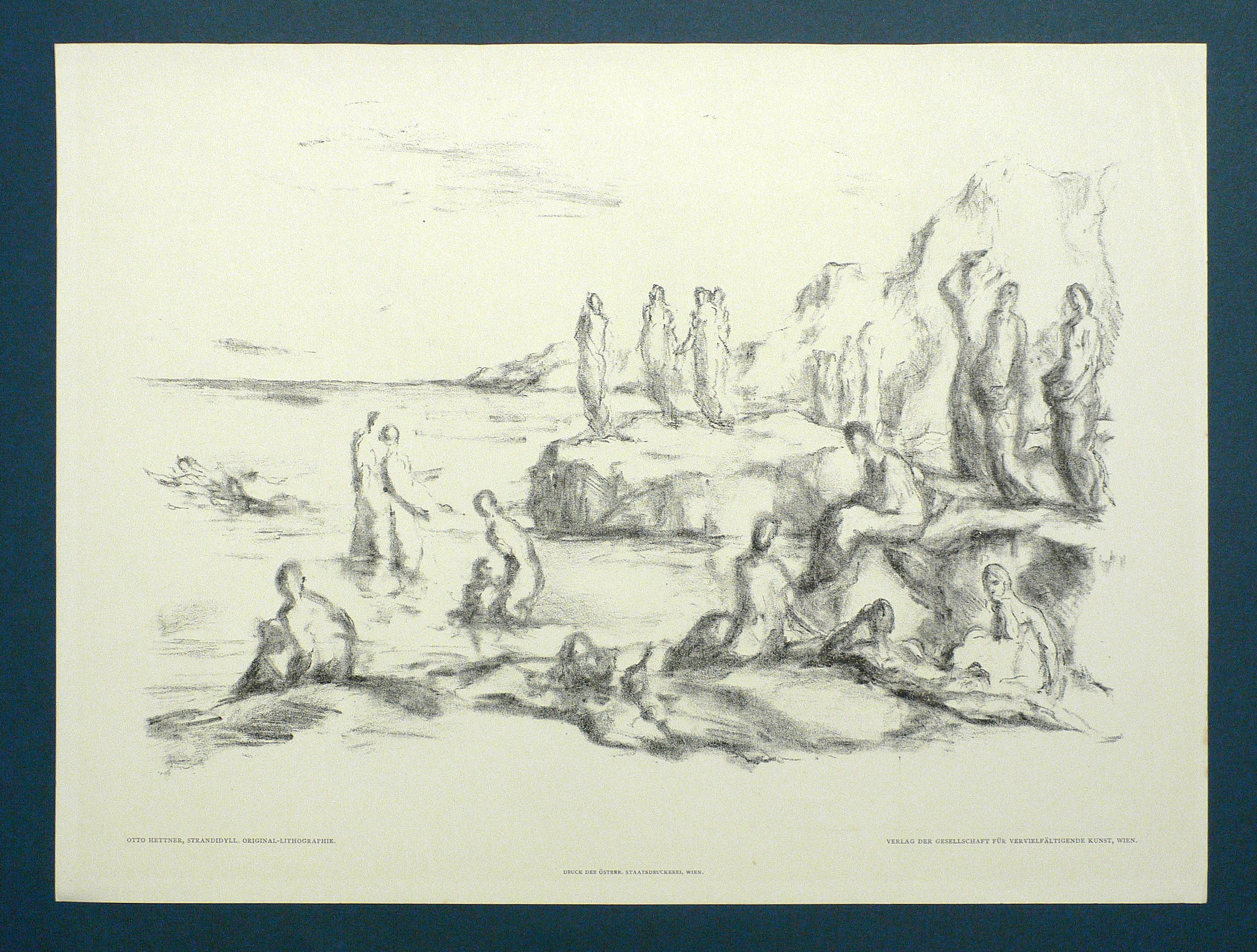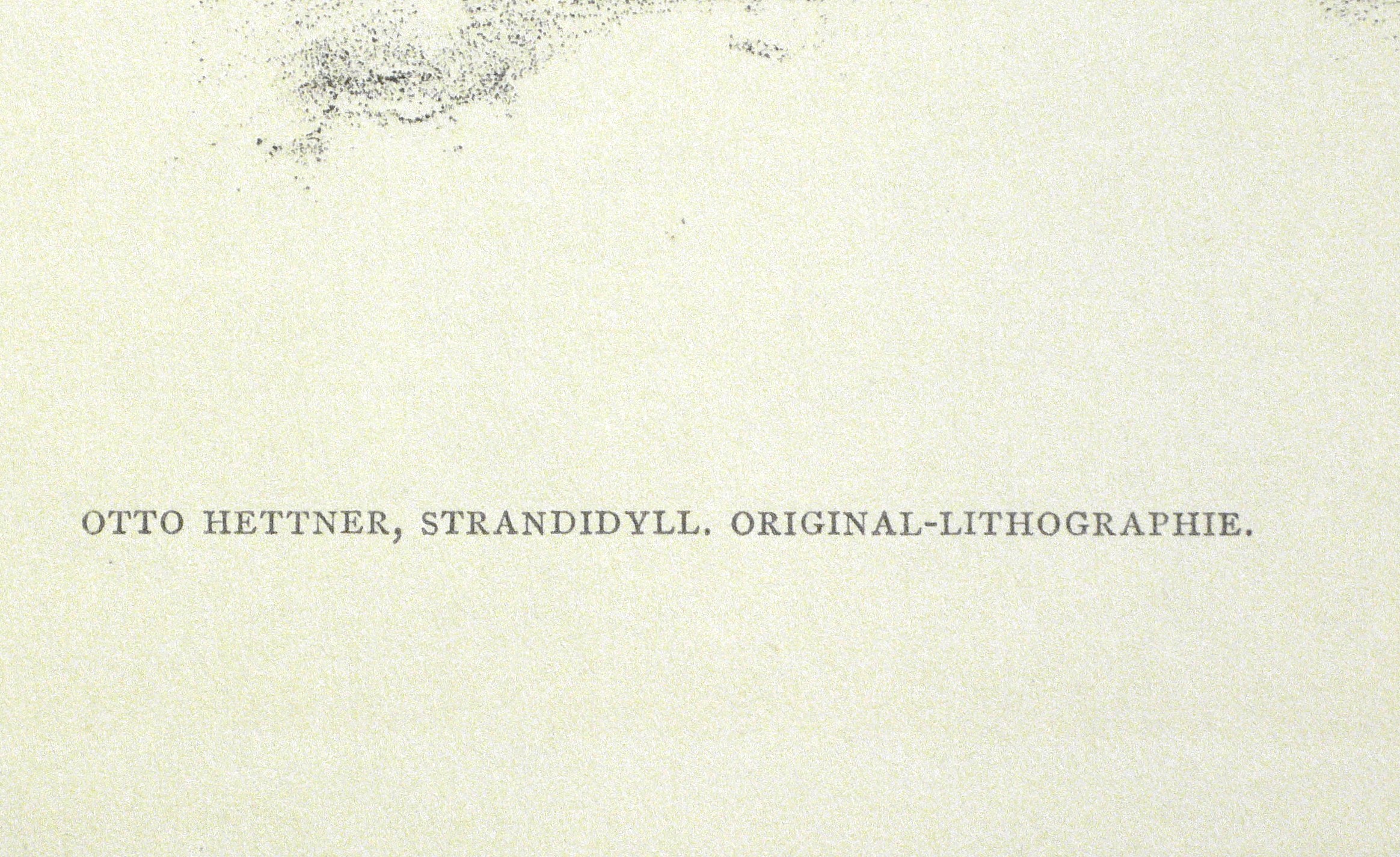 Aus: Die Graphischen Künste (Wien: Gesellschaft für Vervielfältigende Kunst 1924), Bd. 47. – Nicht handsigniert. Unterhalb der Darstellung typografisch bezeichnet: ″Otto Hettner, Strandidyll, Original-Lithographie″. Mittig Druckeradresse und rechts Verlagsadresse. – Unscheinbare Randmängel. Insgesamt sehr gut erhalten.