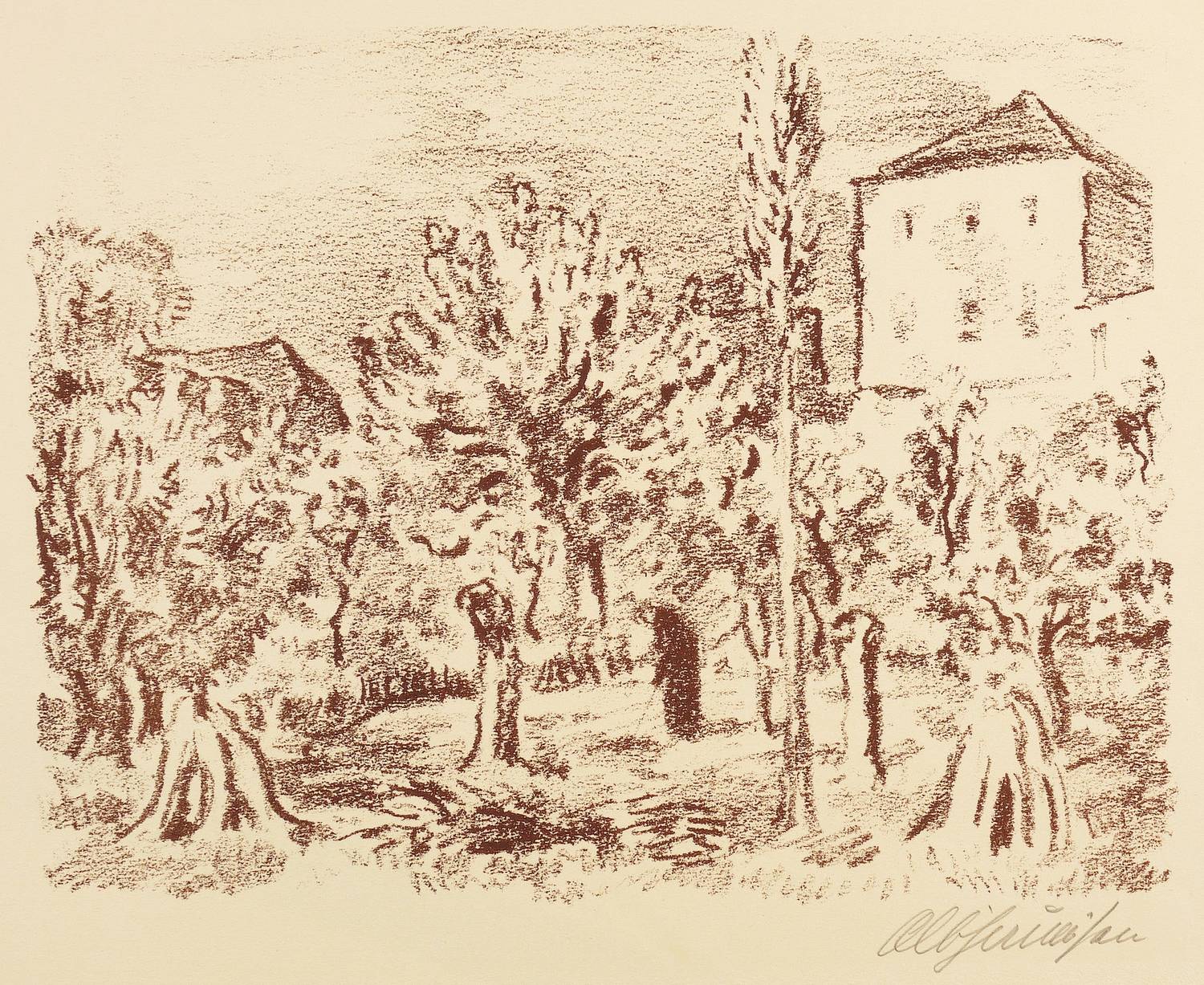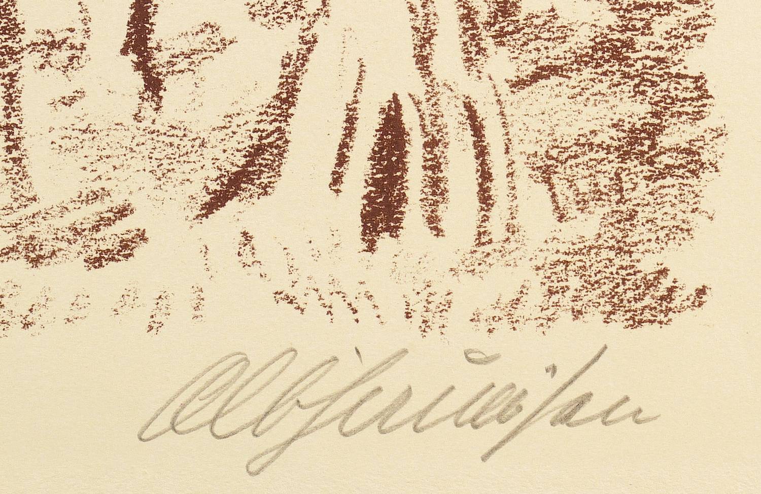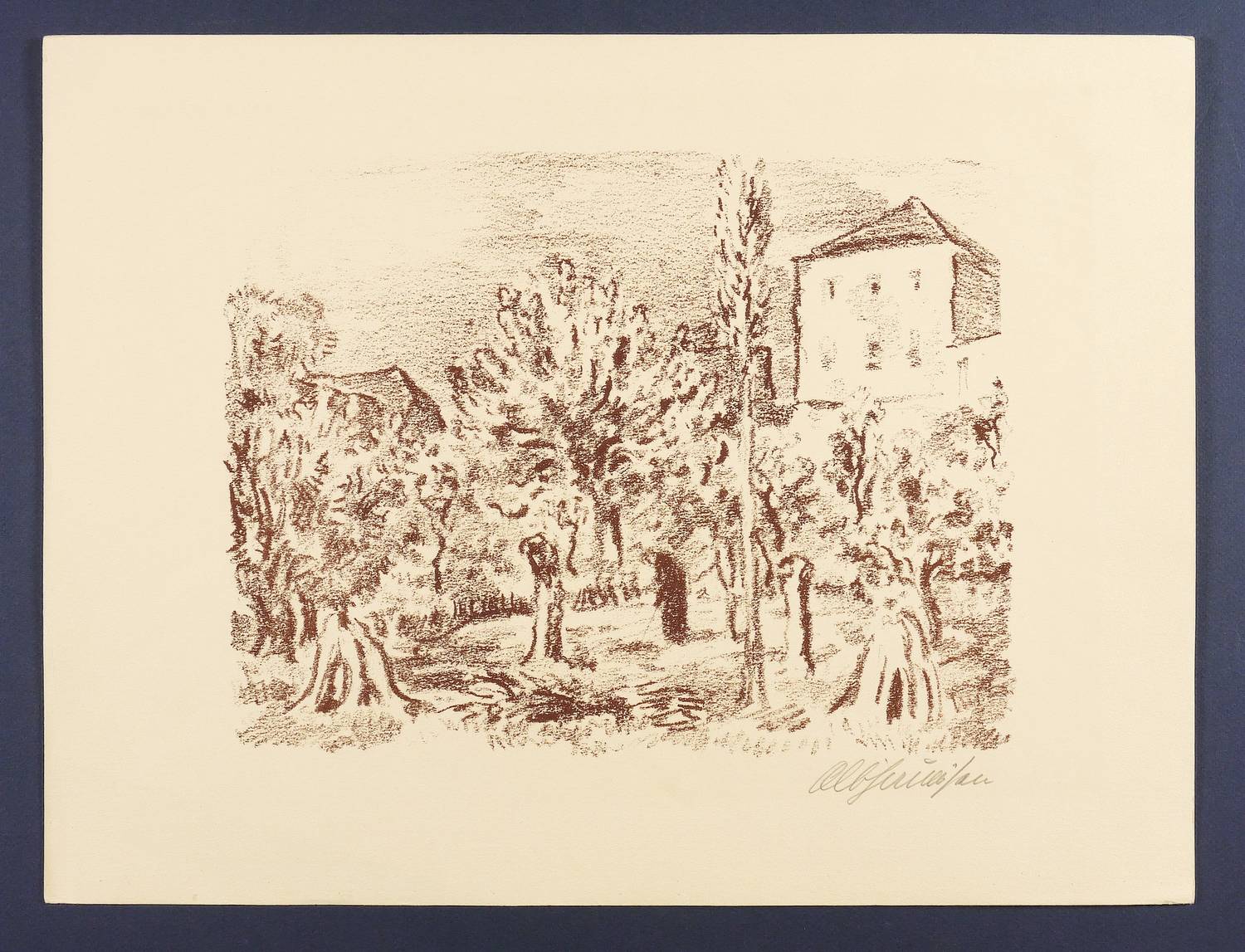 Rechts unten in Bleistift signiert. Verso Stempel der Kunstdruckerei Künstlerbund Karlsruhe mit handschriftlicher Katalognummer ″9″. – Sehr gut erhalten.