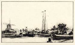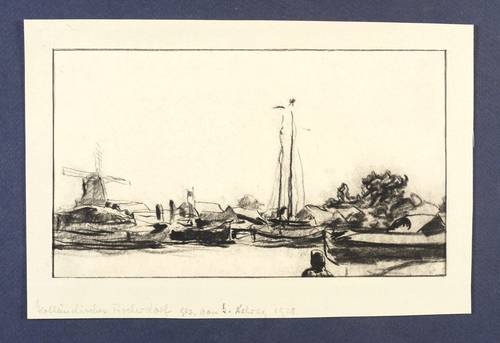 Links unten in Bleistift bezeichnet: ″Holländisches Fischerdorf gez. von J. Schrag 1928″. – Alt hinter schmales Passepartout geklebt. Guter Zustand.