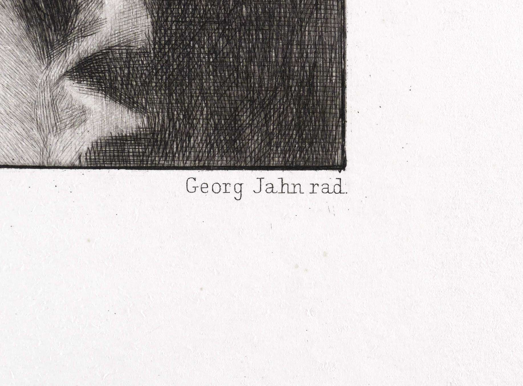 1898/1900. Radierung / Strichätzung & Kaltnadel, mit Plattenton, in Schwarz, auf weißem Kupferdruckkarton. – Originale Künstlergrafik, von Georg Jahn. – 22,8 x 18,2 cm (Darstellung / Einfassungslinie), 27,9 x 21,2 cm (Platte), 41 x 31 cm (Blatt).