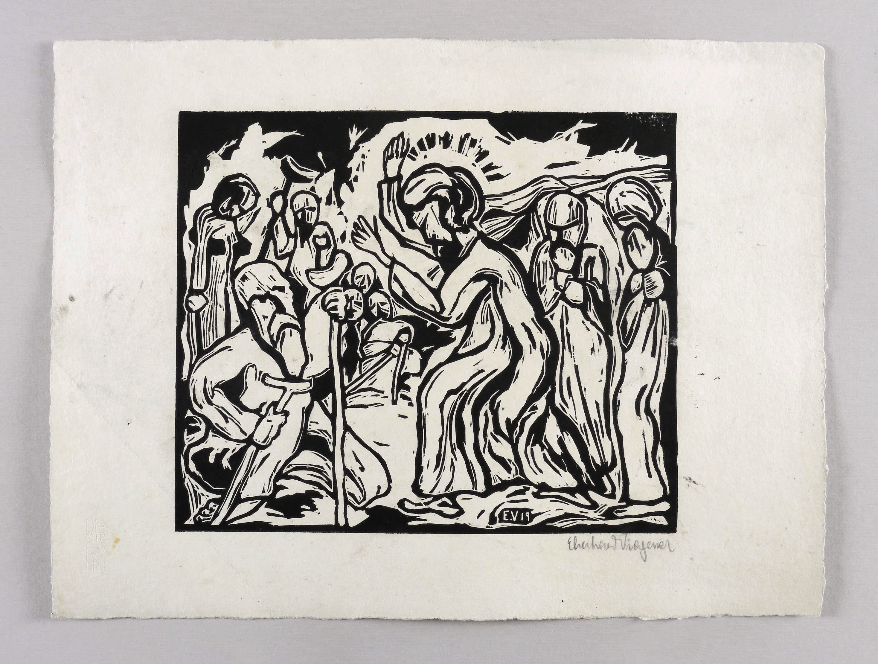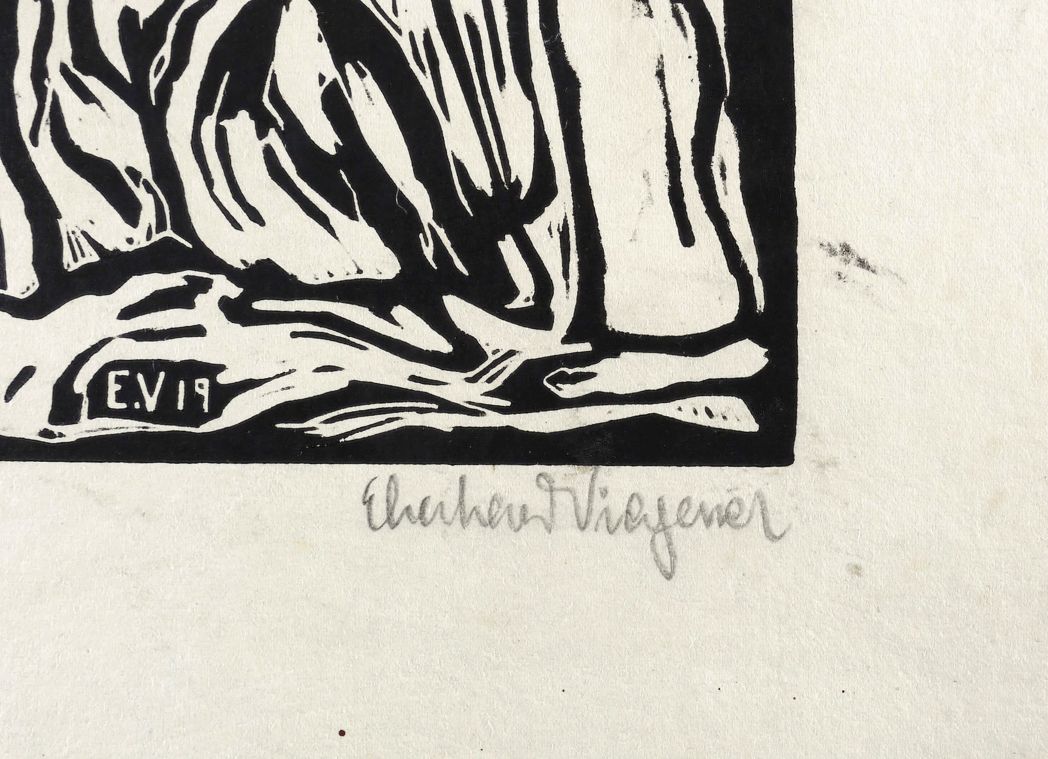 Söhn HDO 72705-9. Kerber 128. Tjardes D 61. Jahn-Berger 49. – Aus: Die Schaffenden (Berlin: Gustav Kiepenheuer Verlag 1919/1920), Bd. 2. – Rechts unten in Bleistift signiert: ″Eberhard Viegener″. Im Druckstock direkt darunter Signatur und Jahr: ″E.V. 19″. In der Blattecke links unten Trockenstempel des Euphorion Verlags. – Originalgrafische Beilage der Kunstzeitschrift ″Die Schaffenden″. – Originalrandiges Blatt. Im breiten Rand leichte Verschmutzungen bzw. Flecken. Mäßig guter Zustand.