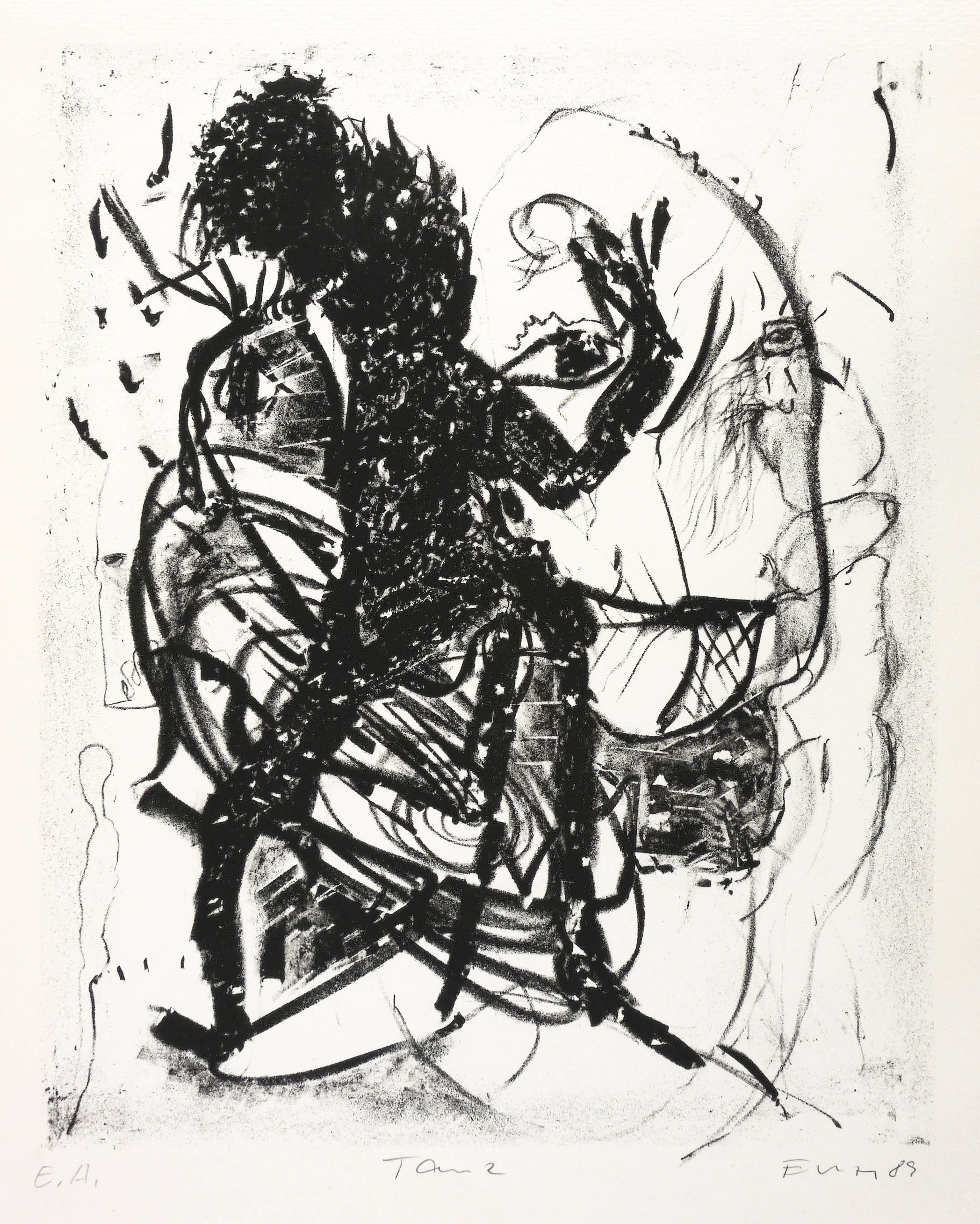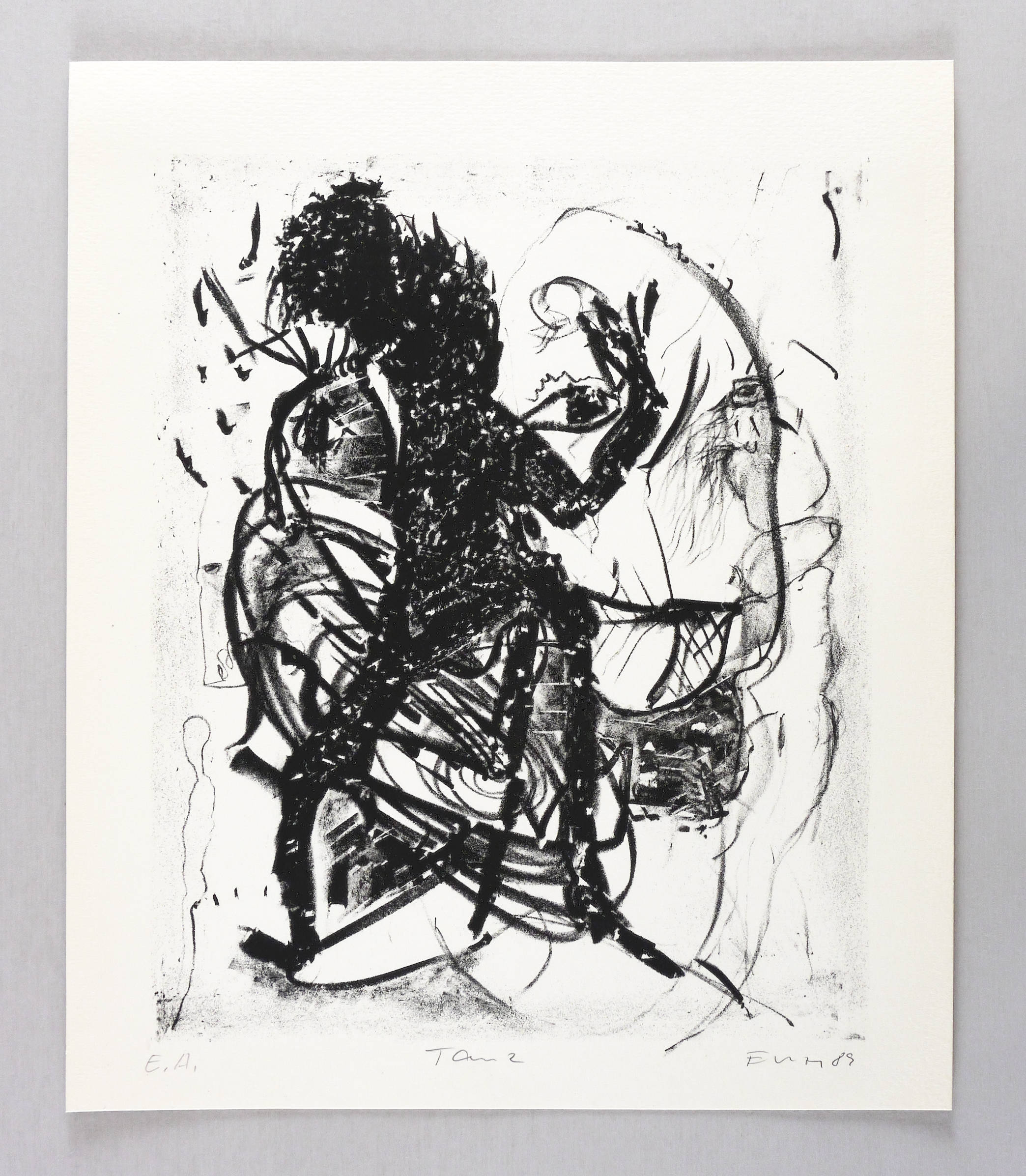 1989. Lithografie / Kreide- & Pinsellithografie, in Schwarz, auf hellchamois Kupferdruck. – Originale Künstlergrafik, von Erich-Wolfgang Hartzsch. – Künstlerexemplar (e.a.). – 29,7 x 24,0 cm (Darstellung / Druckbild), 35 x 30 cm (Blatt).