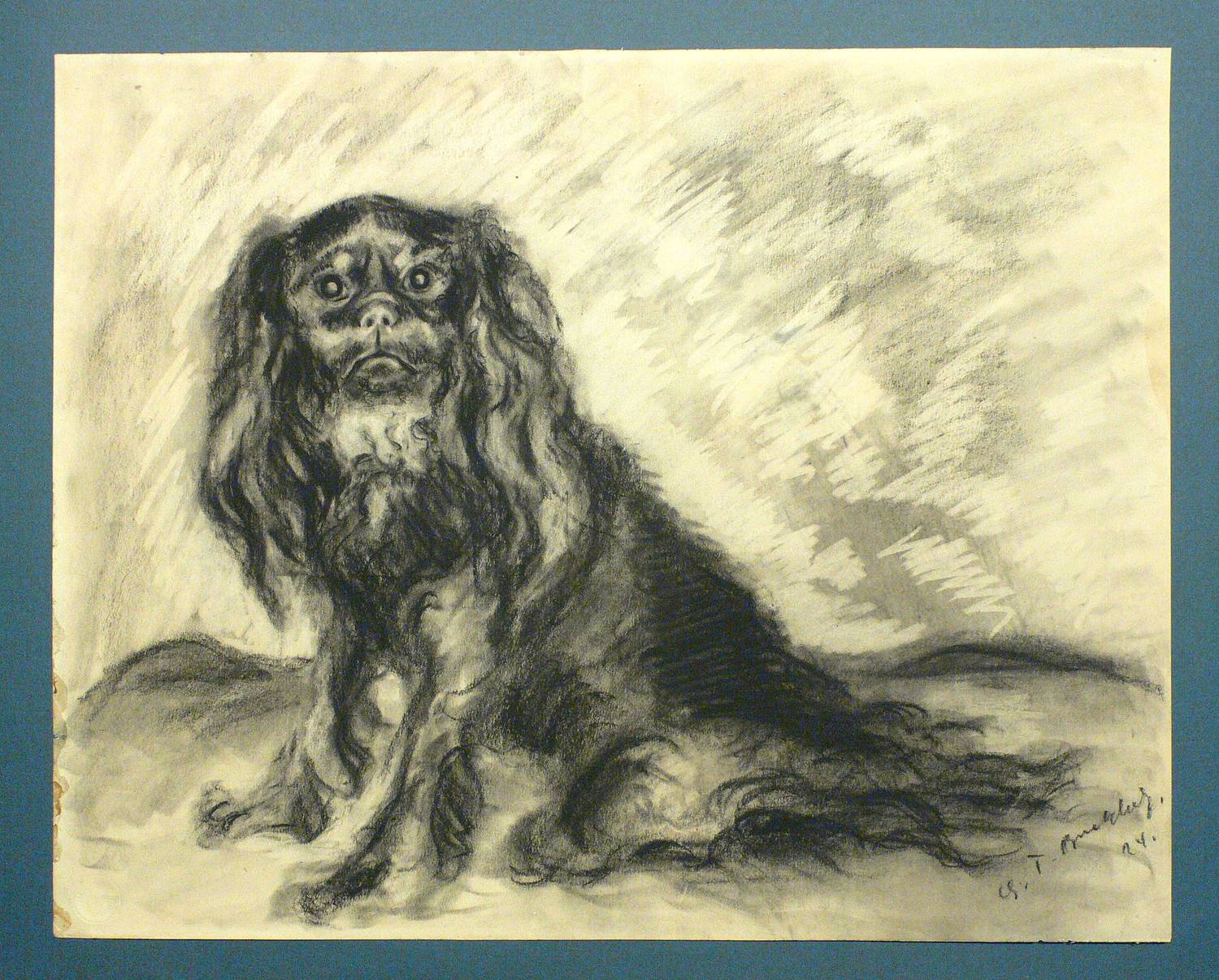 Rechts unten unleserlich signiert, etwa ″G.T. [Bucklatz?]″ sowie datiert ″[19]24″. Am Blattrand links unten Trockenstempel des Papierfabrikanten ″Leonh. Niethammer Frankfurt″. – Die Zeichnung steht in ihrem Duktus den wiederkehrenden Darstellungen des King Charles Spaniels von Richard Müller nahe, die ebenfalls in den 1920er Jahren entstanden. Eine Zuschreibung an Richard Müller selbst kommt trotz der hohen zeichnerischen Qualität aufgrund stilistischer Besonderheiten eher nicht in Betracht. – Papier gebräunt. Leichte Randmängel. Am linken Blattrand Kleberückstände und leichte Papierschäden. Am Blattrand rechts braunfleckig. Unterer Blattrand mit kleinem Einriß. Und oben etwas knickspurig. Insgesamt mäßig gut erhalten.