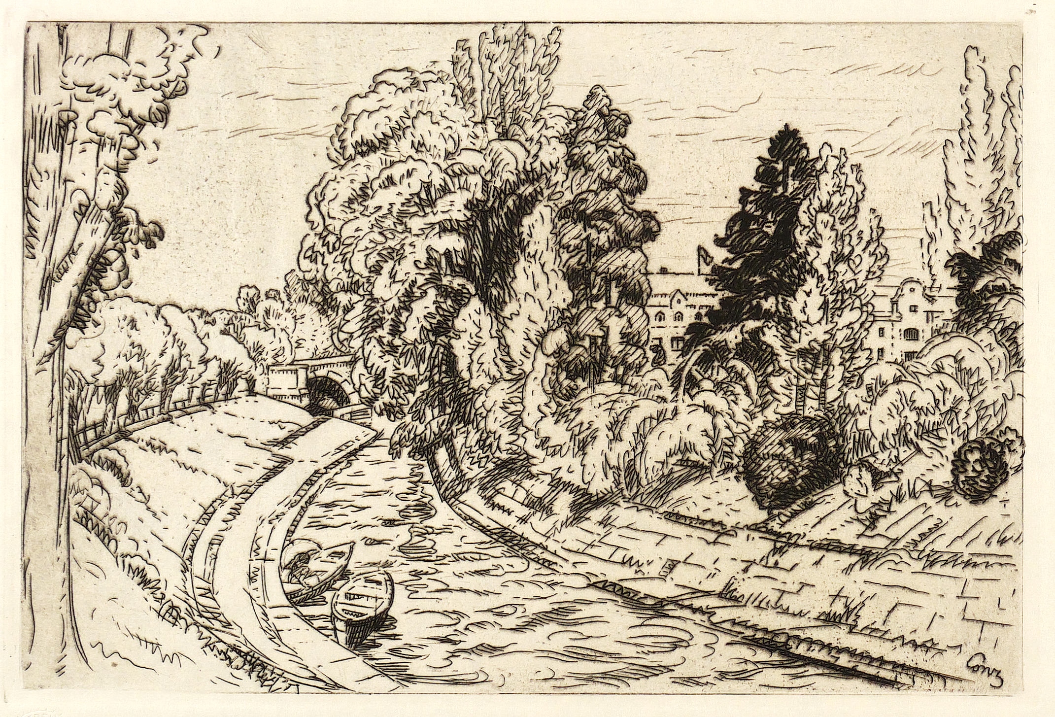 1928. Radierung / Strichätzung, in Schwarz, auf hellem wolkigem Büttenpapier. – Originale Künstlergrafik, von Walter Conz. – 18,1 x 26,7 cm (Darstellung), 18,8 x 27,6 cm (Platte), 38 x 50 cm (Blatt).