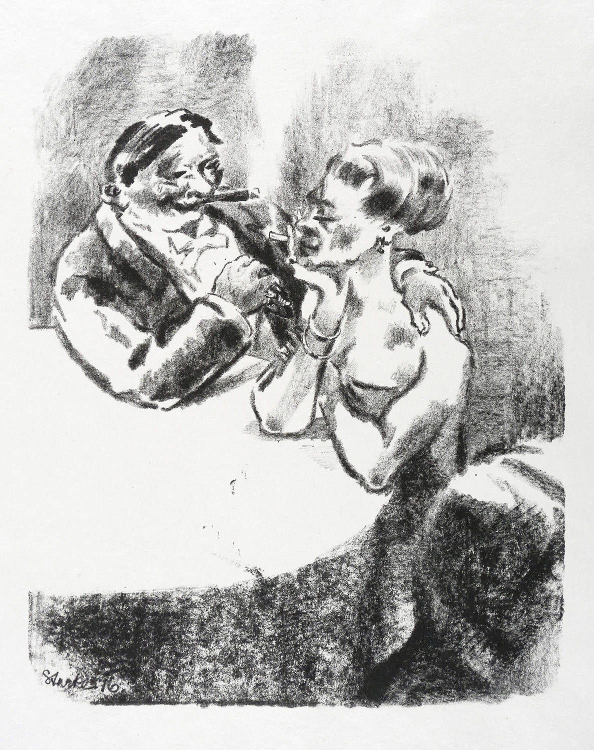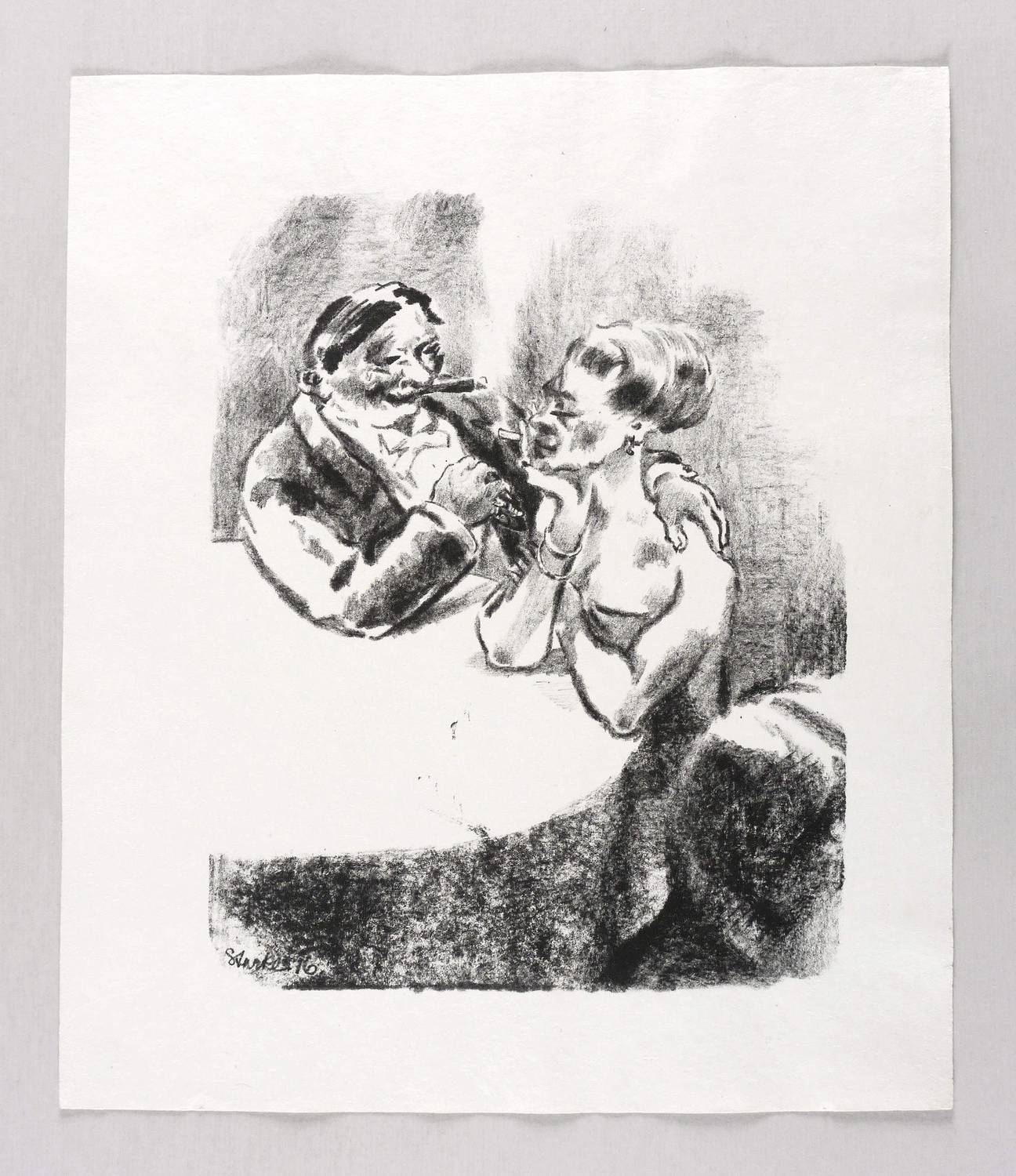 Verso in Bleistift signiert: ″O. Starke″. Dazu bezeichnet: ″Probeabzug aus der Druckerei Lassally, Berlin″. Im Stein links unten Signatur und Jahr: ″Starke 1916″. – Wohl für die Edition verworfenes Motiv aus der Folge ″Die neue Gesellschaft″, die 1916 in der Zeitschrift ″Bildermann″ erschien (Der Bildermann. Steinzeichnungen fürs deutsche Volk, Berlin: Paul Cassirer 1916. - Hier der autorisierte Probedruck vor der Auflage für den ″Bildermann″. – Tadellos erhalten. Sehr guter Zustand.