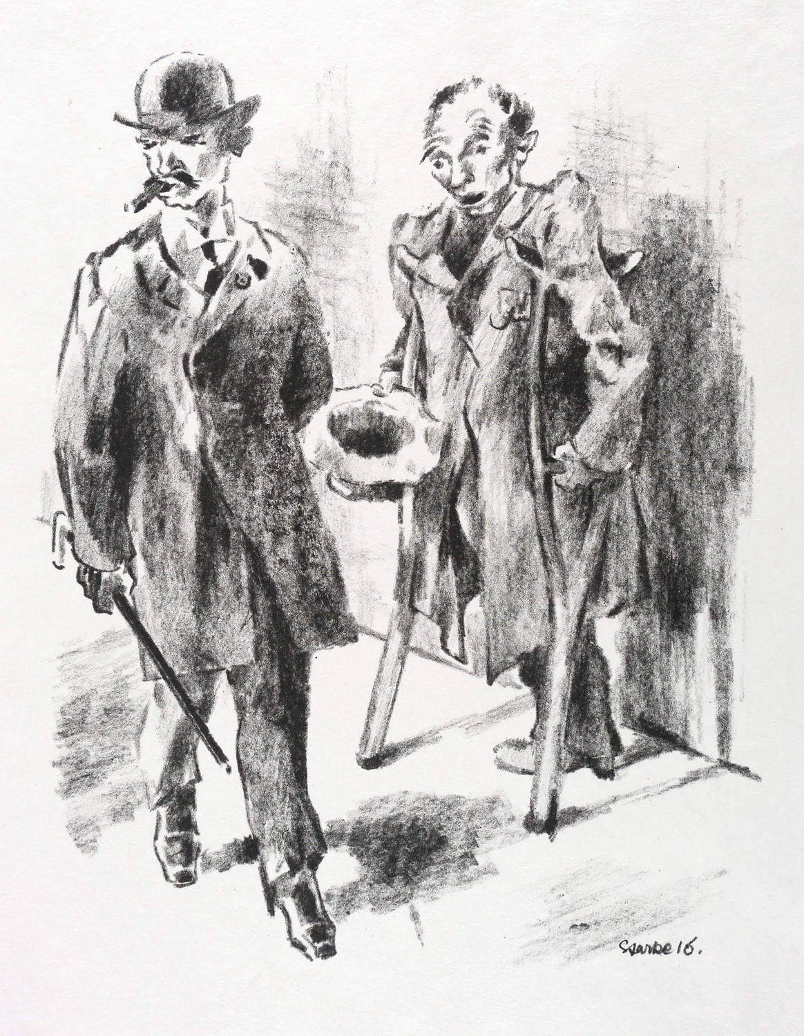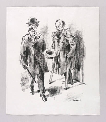 Verso in Bleistift signiert: ″O. Starke″. Dazu bezeichnet: ″Probeabzug aus der Druckerei Lassally, Berlin″. Im Stein rechts unten Signatur und Jahr: ″Starke 16.″ – Blatt Nr. 3 aus der Folge ″Die neue Gesellschaft″, die 1916 in der Zeitschrift ″Bildermann″ erschien (Der Bildermann. Steinzeichnungen fürs deutsche Volk, Berlin: Paul Cassirer 1916. - Hier der autorisierte Probedruck vor der Auflage für den ″Bildermann″. – Tadellos erhalten. Sehr guter Zustand.