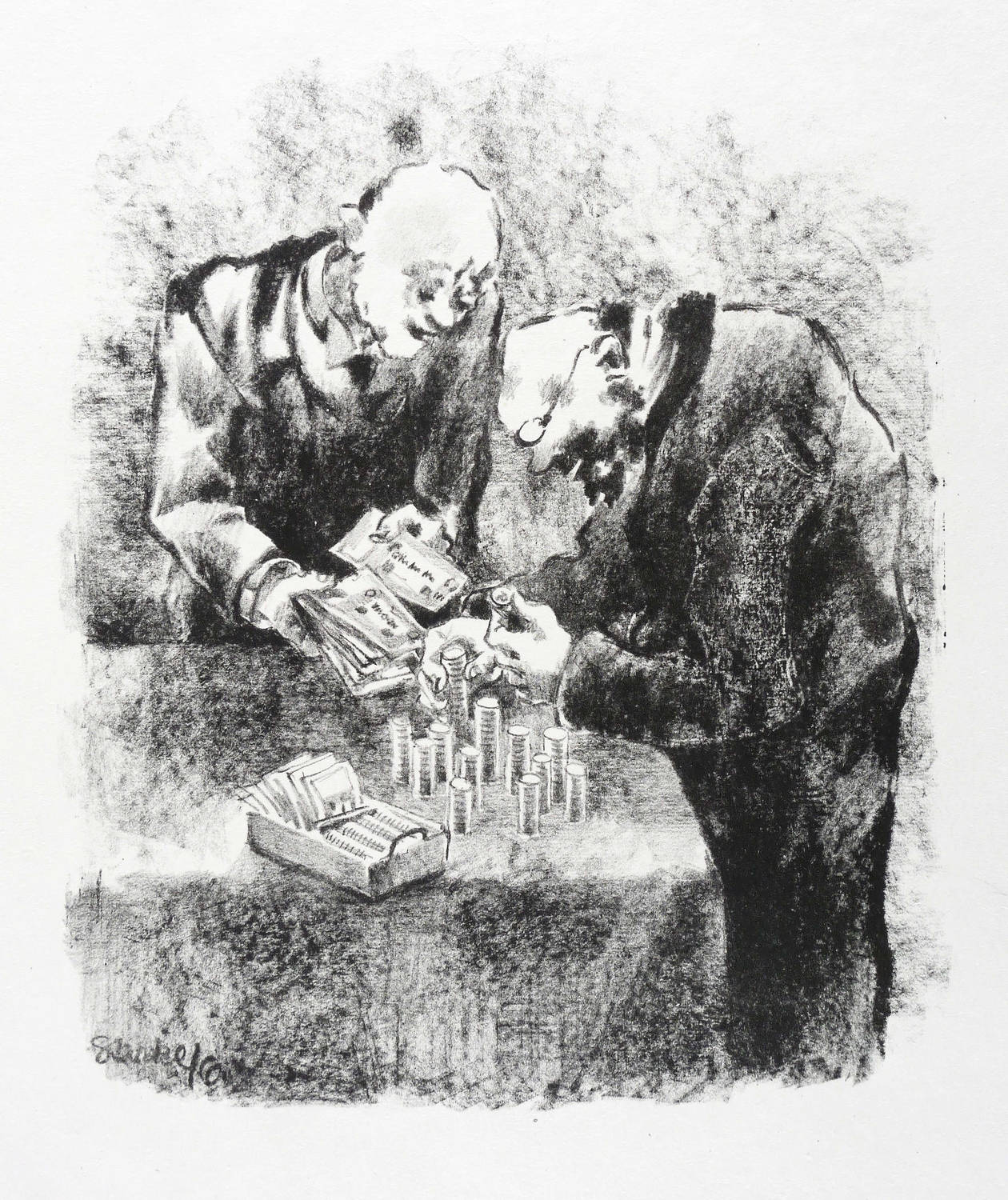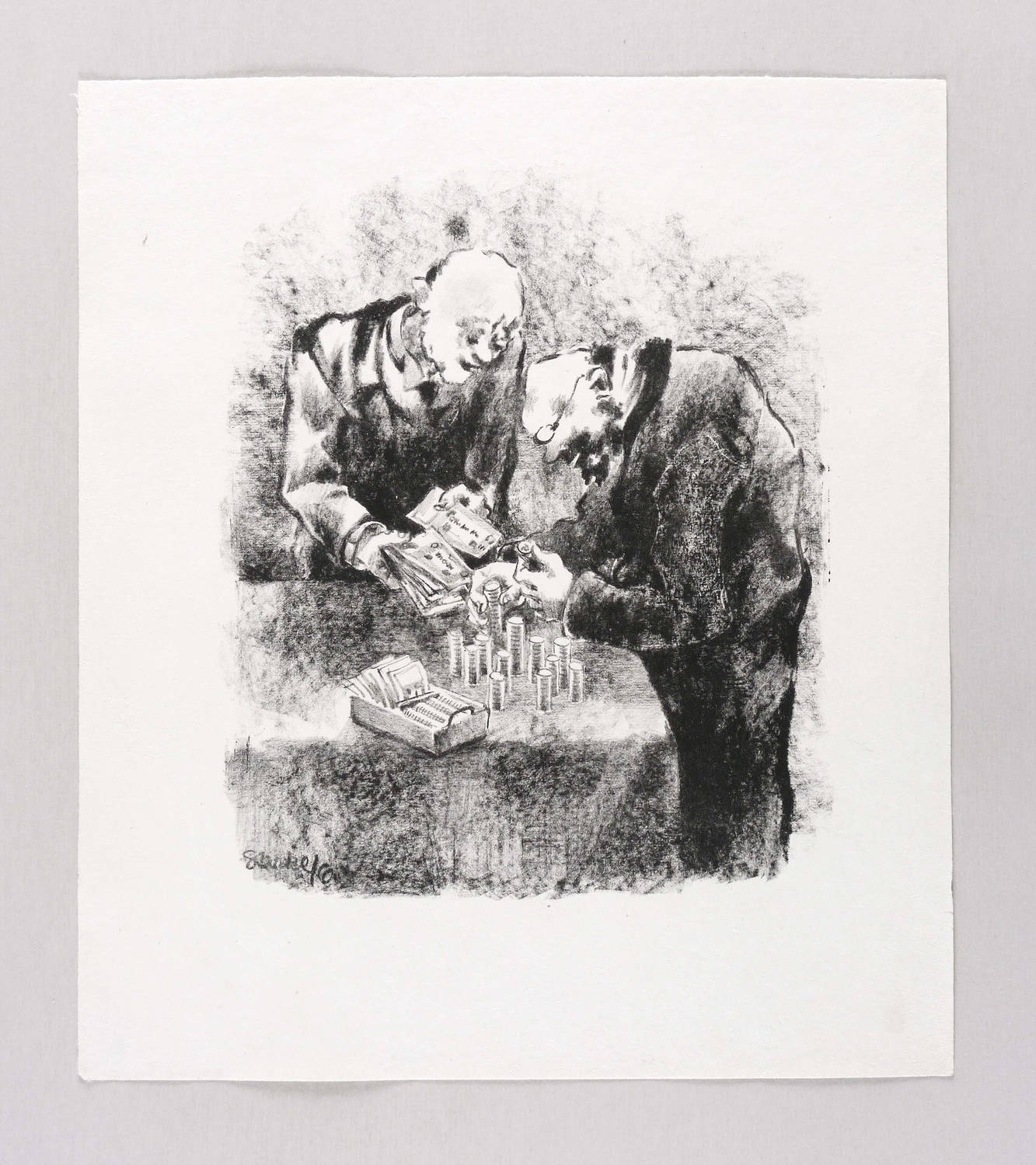 Verso in Bleistift signiert: ″O. Starke″. Dazu bezeichnet: ″Probeabzug aus der Druckerei Lassally, Berlin″. Im Stein links unten Signatur und Jahr: ″Starke 16.″ – Blatt Nr. 4 aus der Folge ″Die neue Gesellschaft″, die 1916 in der Zeitschrift ″Bildermann″ erschien (Der Bildermann. Steinzeichnungen fürs deutsche Volk, Berlin: Paul Cassirer 1916. - Hier der autorisierte Probedruck vor der Auflage für den ″Bildermann″. – Tadellos erhalten. Sehr guter Zustand.