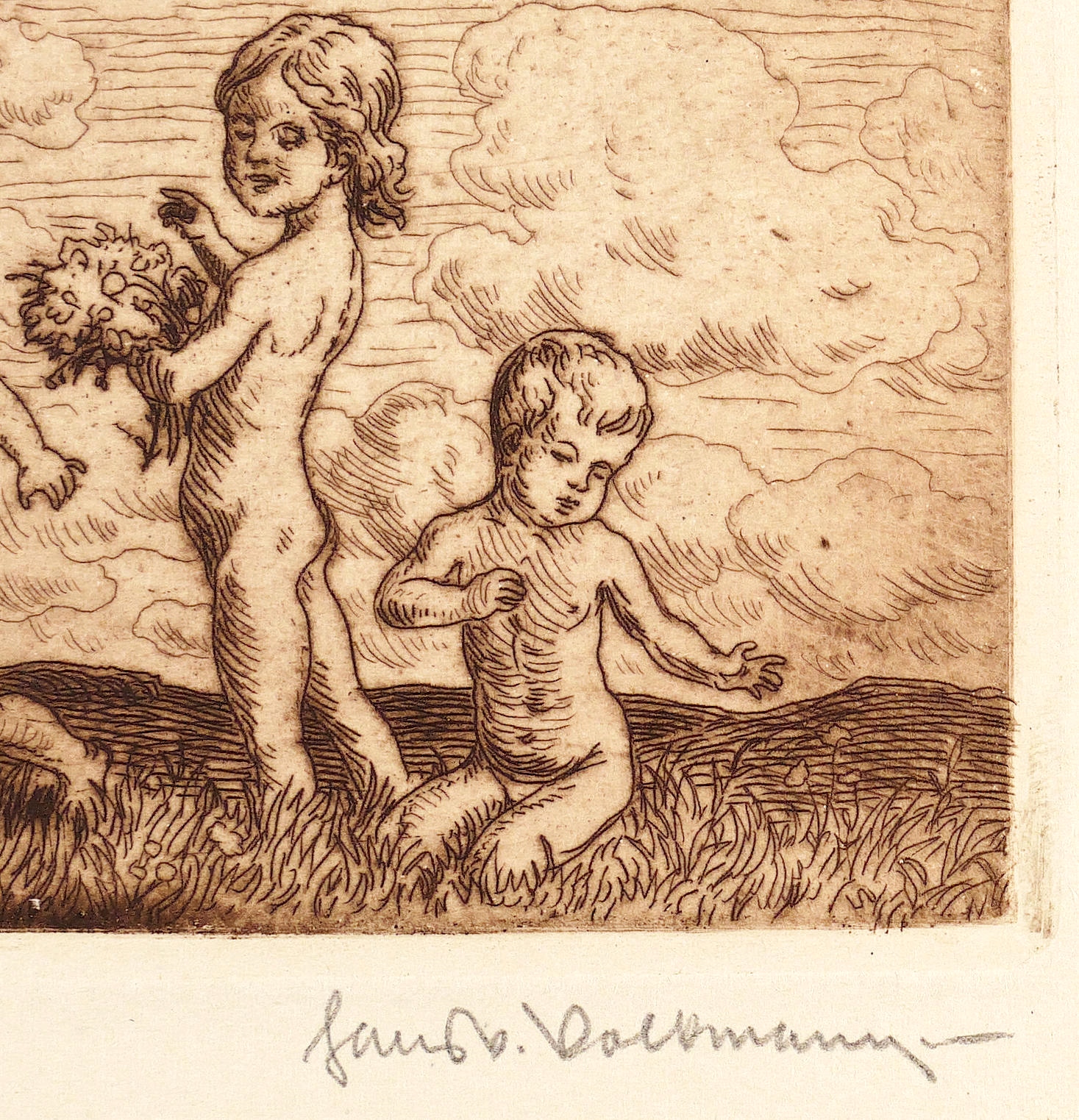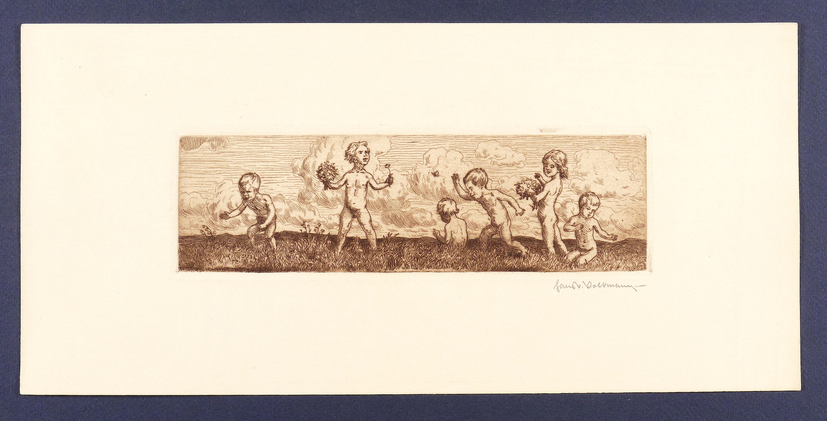 1909. Radierung / Strichätzung, mit Plattenton, in Braun, auf gelbem Kupferdruckkarton. – Originale Künstlergrafik, von Hans Richard von Volkmann. – 6,5 x 22,0 cm (Darstellung), 7,1 x 22,5 cm (Platte), 18 x 37 cm (Blatt).