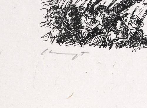 Söhn 224. – Aus: Max Slevogt, Ein Liederbuch. 34 Federlithographien zu deutschen Liedern (Berlin: Paul Cassirer 1919). – Links unten in Bleistift signiert: ″Slevogt″. Mittig Auflagenbezeichnung: ″13/15″. – Blatt aus der Folge von 34 Federlithografien zu Max Slevogts Liederbuch (Berlin: Cassirer 1919). Hier ein Exemplar aus der nur 15 Exemplare umfassenden signierten Auflage. – Papier sauber und frisch wirkend. In den Blattecken bräunlicher Abklatsch von Montagestreifen im ehemaligen Passepartout, dies aber weit außerhalb der Darstellung. Mäßig guter Zustand.