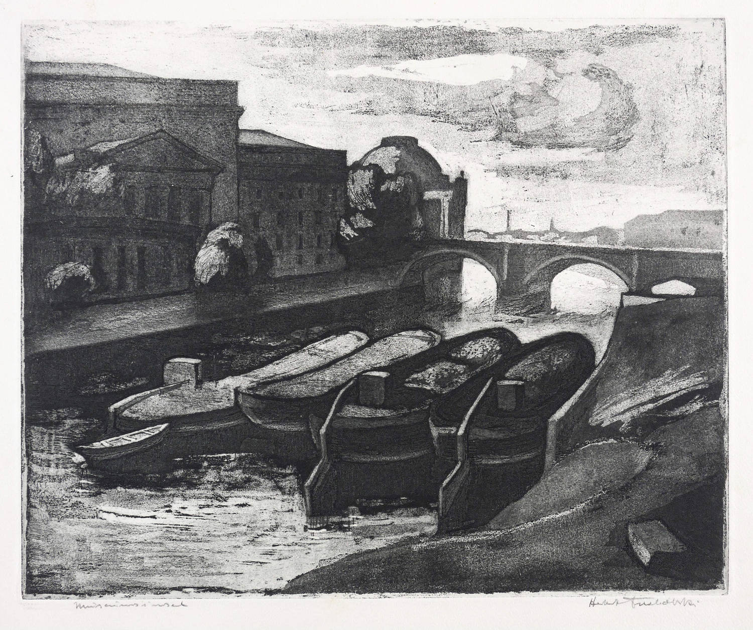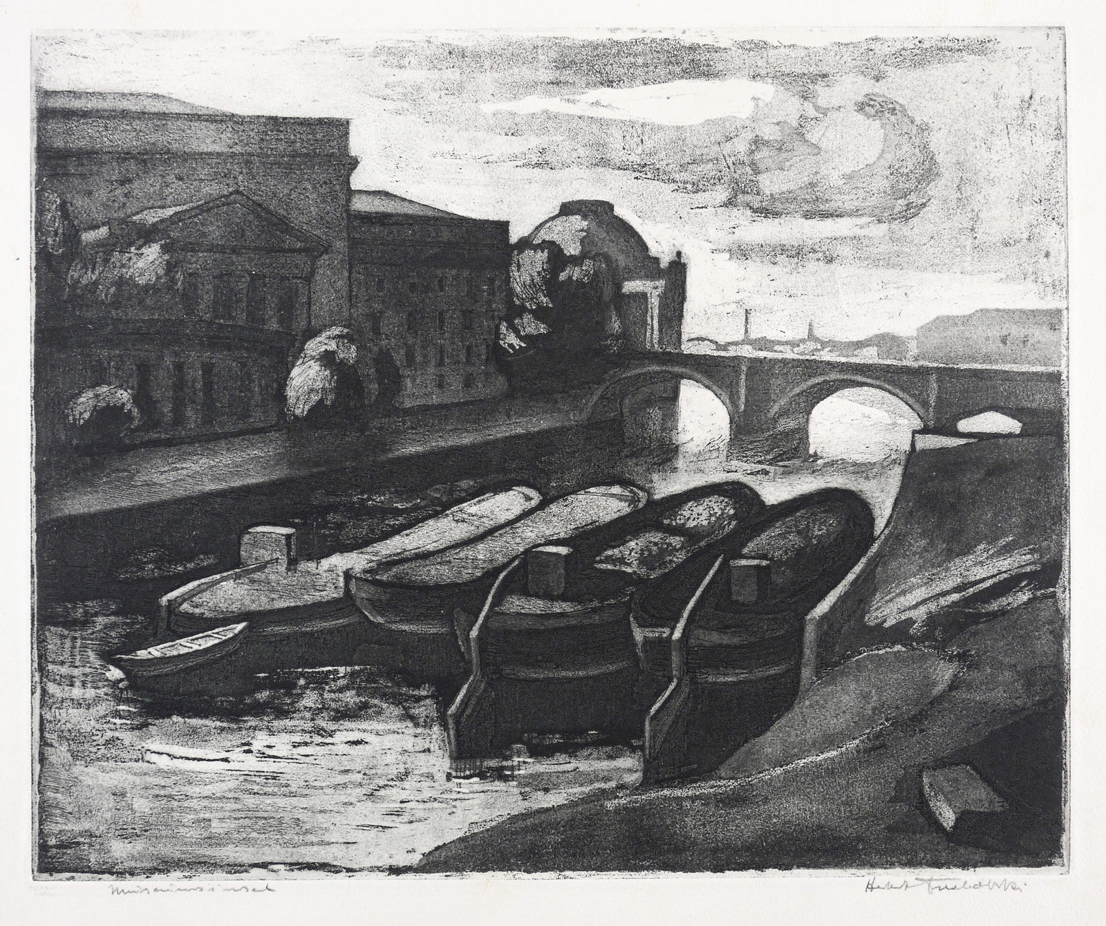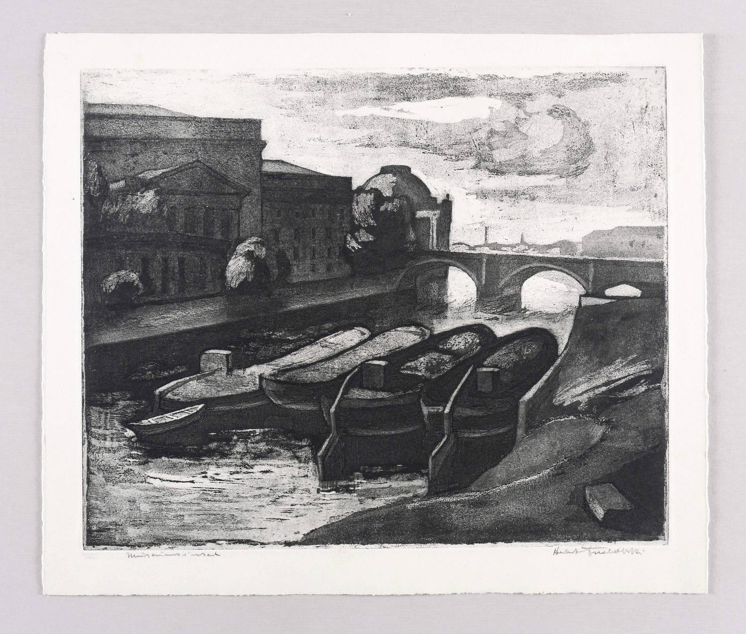 Karnahl 218. – Rechts unten in Bleistift signiert: ″Herbert Tucholski″. Links bezeichnet: ″Museumsinsel″. – Blatt Nr. 6 aus dem sechsteiligen Zyklus ″Berlin an der Spree″. – Auf dem Blattrücken im oberen Rand leichte Montagereste. Sonst tadellos. Sehr guter Zustand.