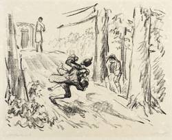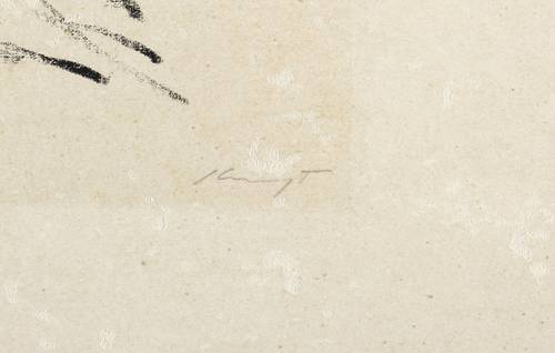 Sievers-Waldmann 317. – Aus: Max Slevogt, Lederstrumpf-Erzählungen (Berlin: Paul Cassirer 1908/1909). – Rechts unten in Bleistift signiert: ″Slevogt″. Links bezeichnet: ″Probedruck″. – Papier mit unscheinbarem Lichtrand begleitend zur Darstellung. Partiell leichter Wurmfrass. Mäßig guter Zustand.