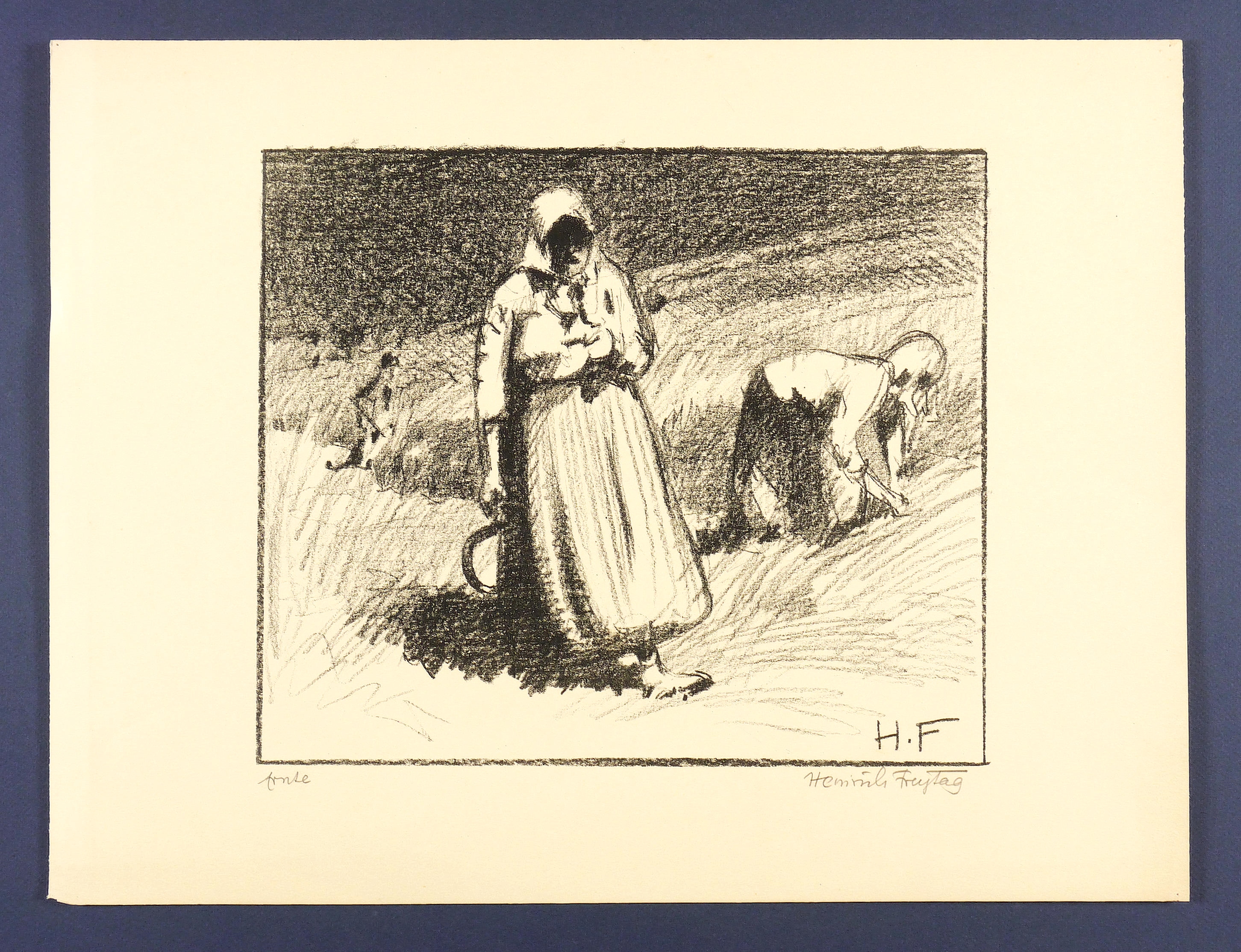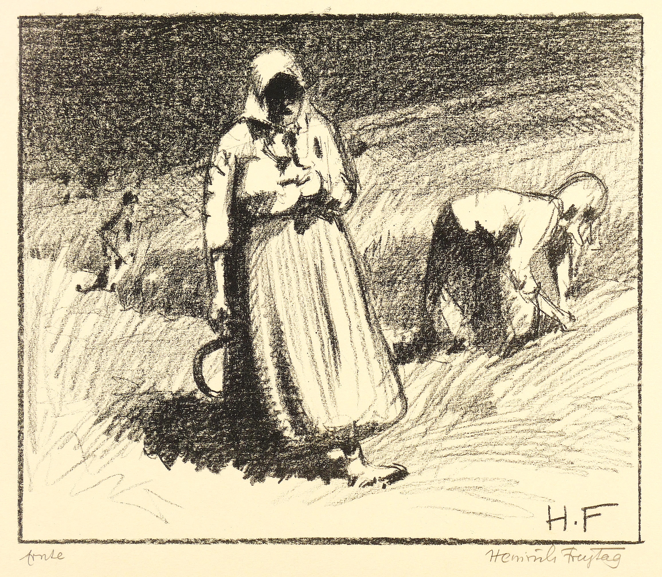 Rechts unten in Bleistift signiert. Links Titel. Im Stein rechts unten Monogramm. Verso Stempel der Kunstdruckerei Künstlerbund Karlsruhe mit handschriftlicher Katalognummer ″H.F. 4″. – Minimale Randmängel. Insgesamt guter Zustand.
