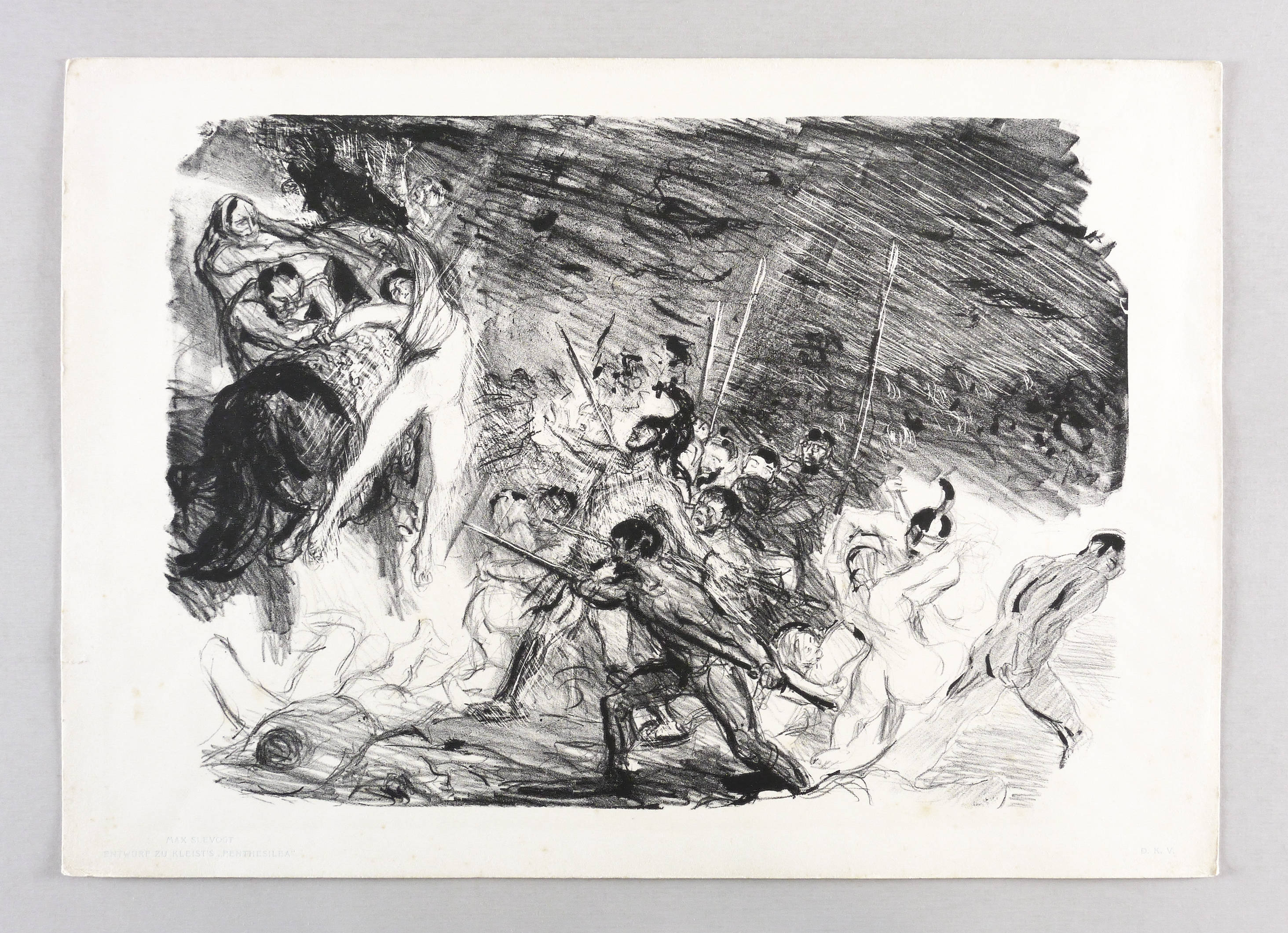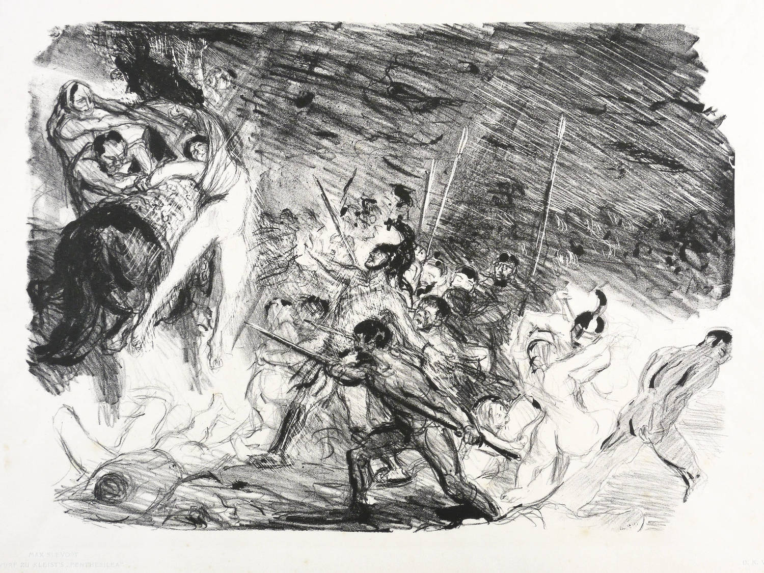 Sievers-Waldmann 13 2 (von 4). – Aus: Deutscher Kunstverein zu Berlin. Vereinsgabe 1904-1905 (Berlin: Deutscher Kunstverein 1905). – Nicht handsigniert. Im unteren Blattrand typografisch in Hellblau bezeichnet: ″MAX SLEVOGT / ENTWURF ZU KLEIST'S PENTHESILEA // D.K.V.″ – Aus der seltenen impressionistischen Mappenedition ″Deutscher Kunstverein zu Berlin″ von 1904/05. – Originalrandiges unbeschnittenes Exemplar. Im linken Blattrand winziger Einriss hinterlegt (9 mm). Karton leicht fleckig. Nur mäßig guter Zustand.