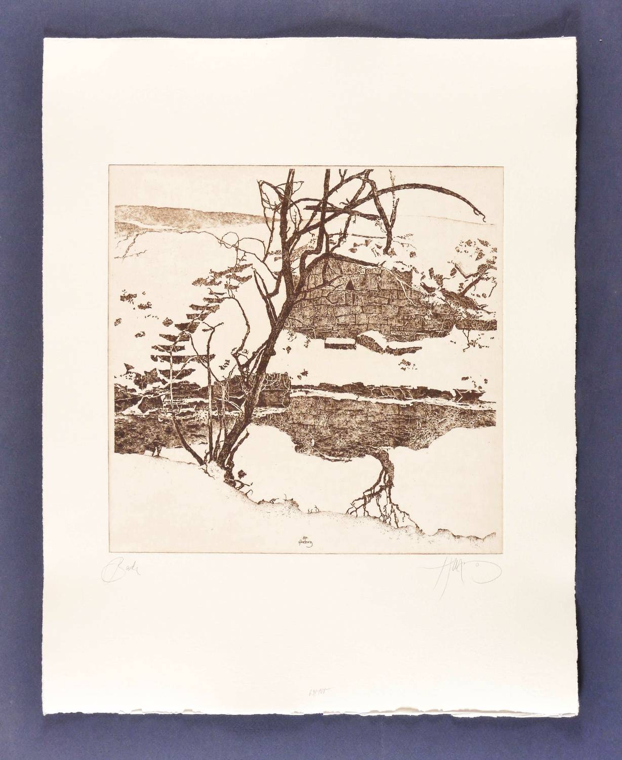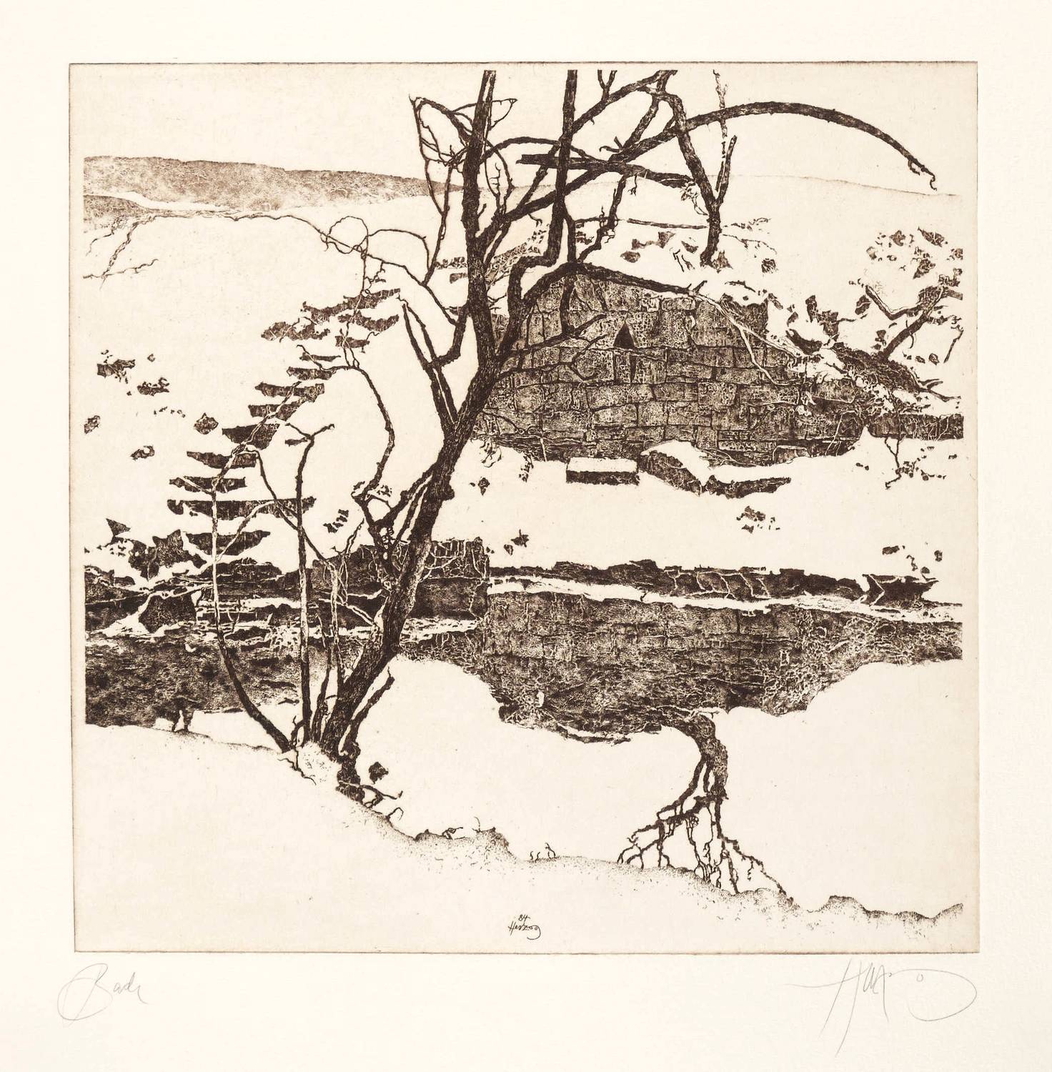 1984. Radierung / Strichätzung, in Rotbraun, mit Plattenton, auf Büttenpapier. – Originale Künstlergrafik, von Walter Herzog. – Auflage Exemplar Nr. 69/100. – 28,6 x 29,1 cm (Darstellung / Platte), 49 x 39,5 cm (Blatt).