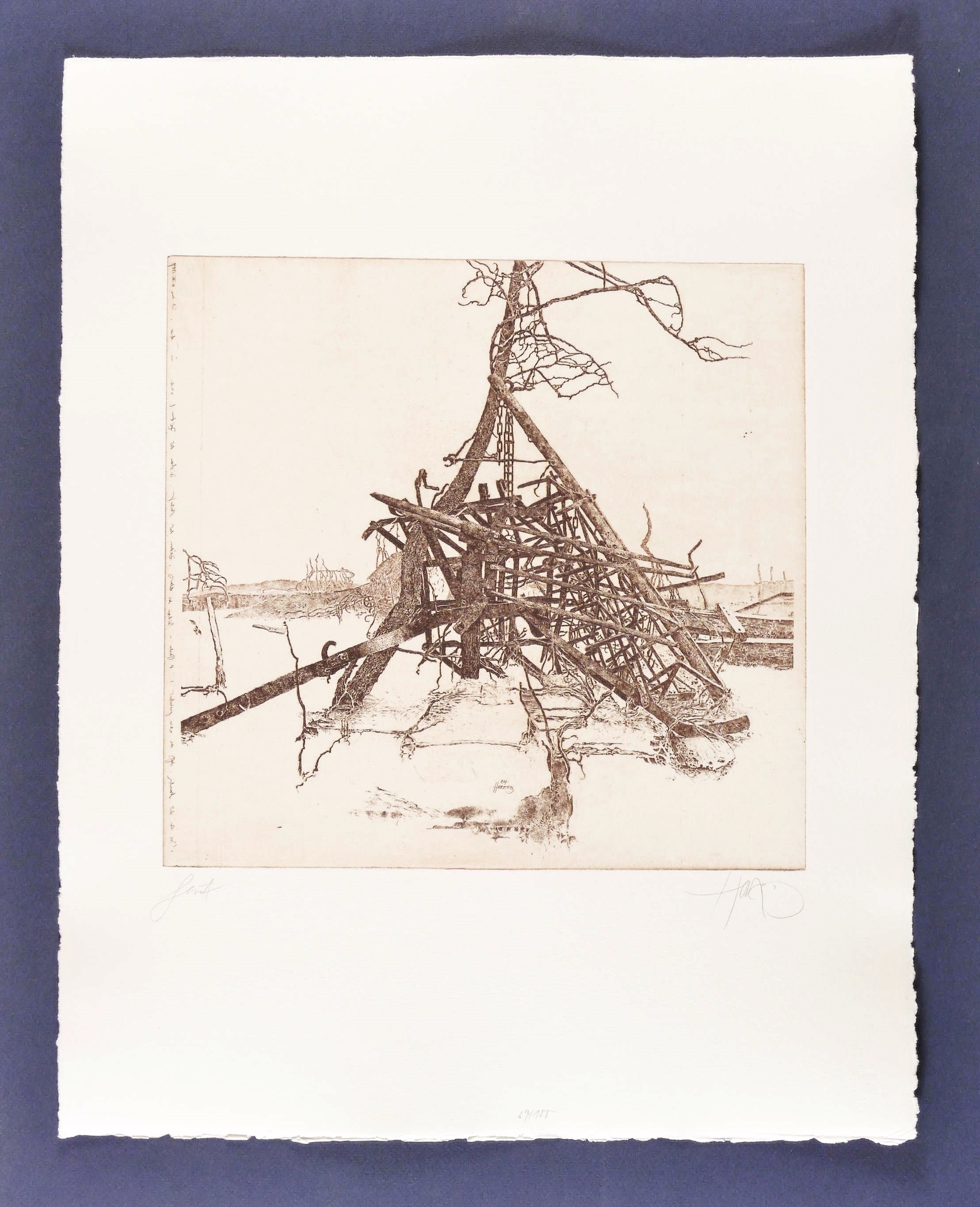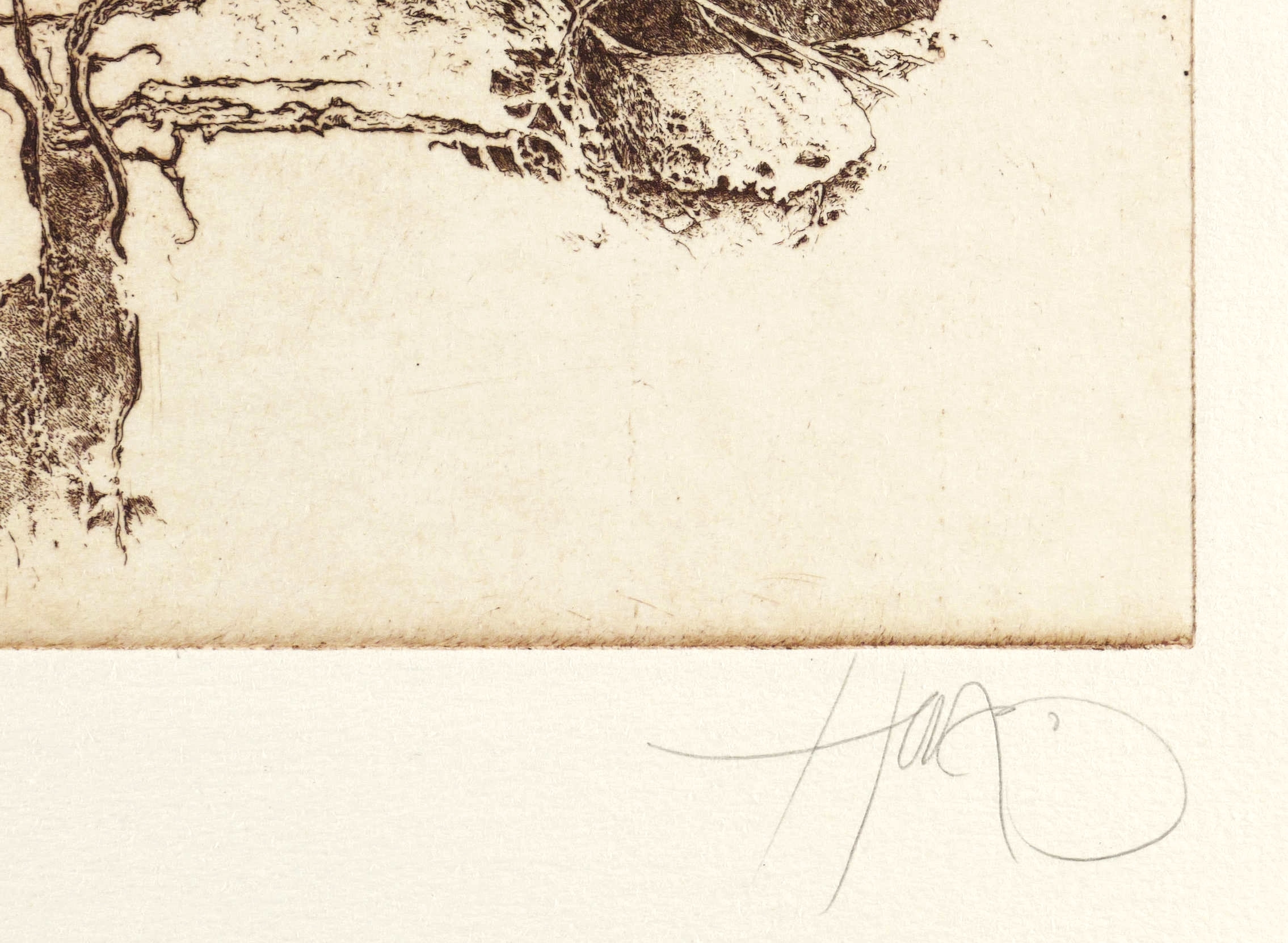 1984. Radierung / Strichätzung, in Rotbraun, mit Plattenton, auf Büttenpapier. – Originale Künstlergrafik, von Walter Herzog. – Auflage Exemplar Nr. 69/100. – 27,8 x 29,4 cm (Darstellung / Platte), 49 x 39,5 cm (Blatt).