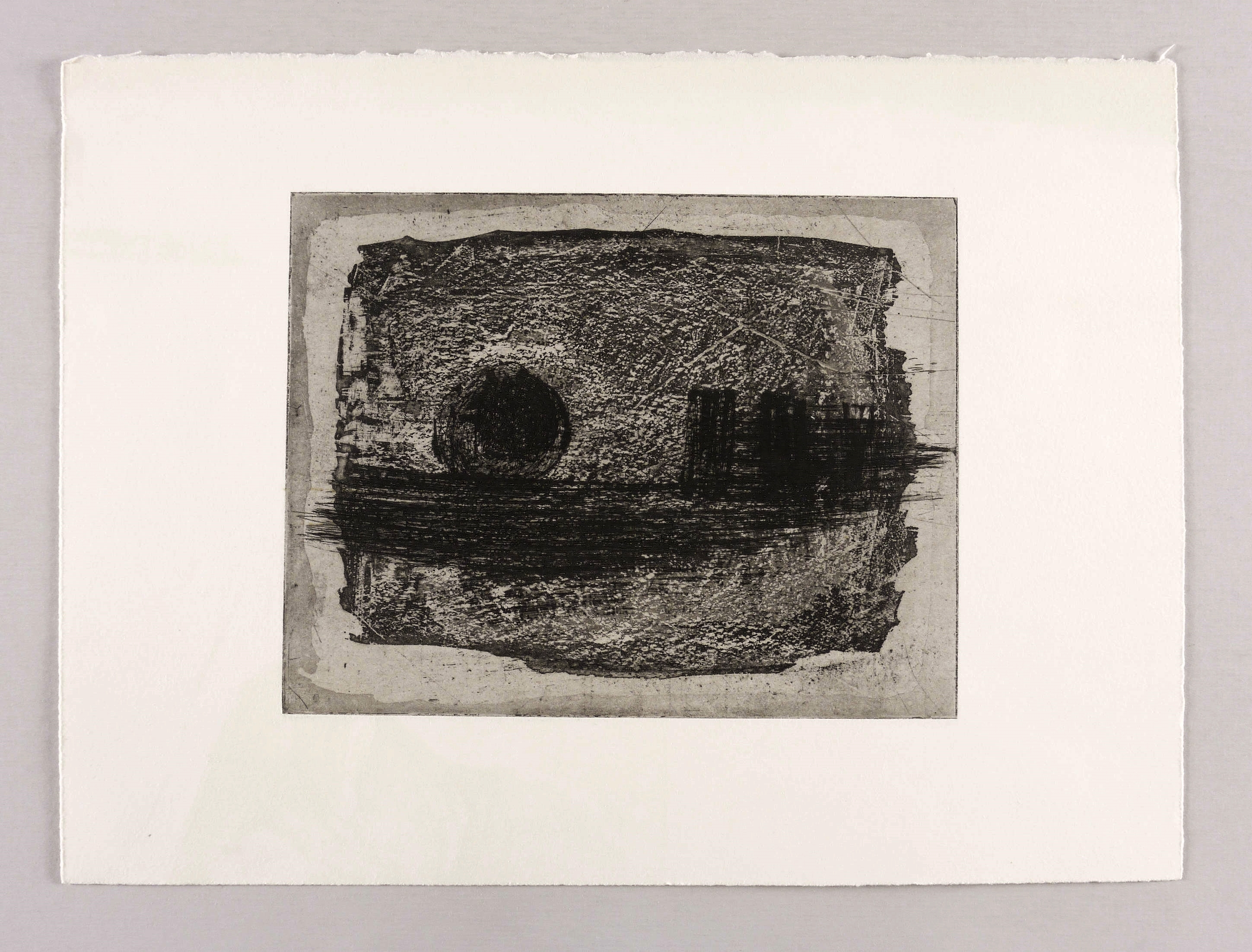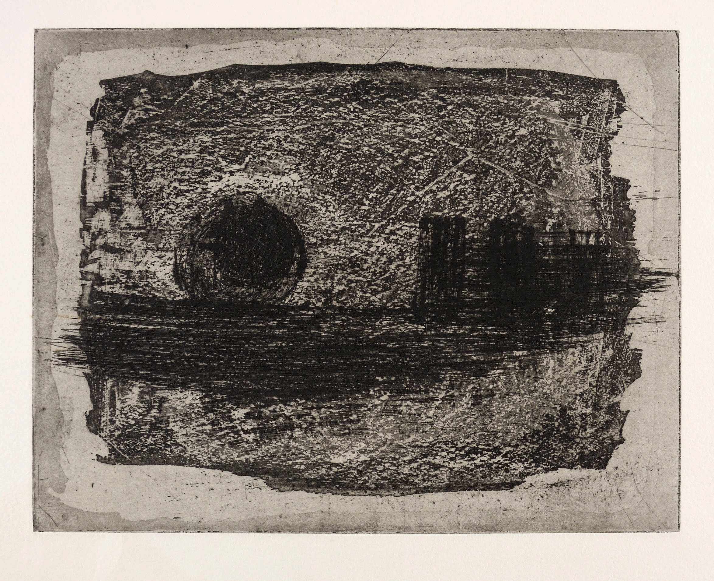 1958. Radierung / Strichätzung & Aquatinta, in Schwarz, auf gelbem Velin. – Originale Künstlergrafik, von Reinhard Drenkhahn. – 17,8 x 22,8 cm (Darstellung / Platte), 29 x 39 cm (Blatt).