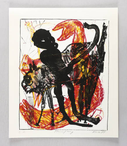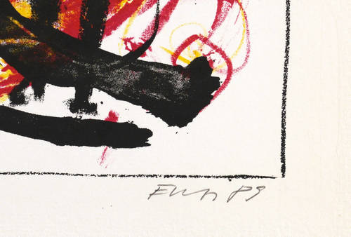 1989. Farblithografie / Kreide- & Pinsellithografie, in Rot, Gelb & Schwarz, auf hellchamois Kupferdruck. – Originale Künstlergrafik, von Erich-Wolfgang Hartzsch. – Künstlerexemplar (e.a.). – 30,2 x 24,2 cm (Darstellung / Druckbild), 36 x 30 cm (Blatt).