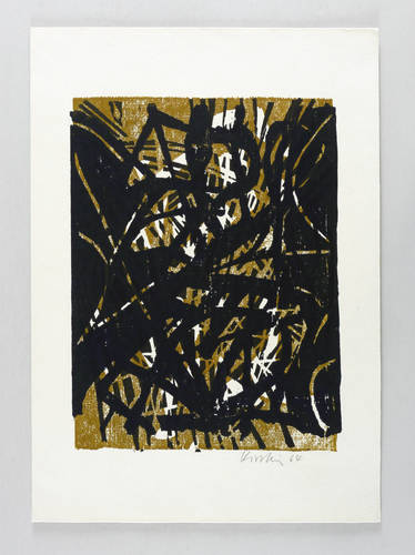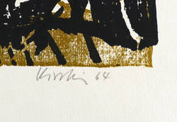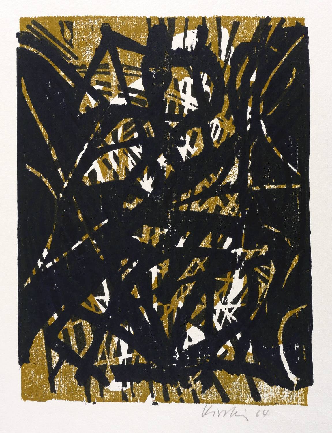 1964. Farbholzschnitt, in Hellbraun & Schwarz, auf hellchamois Velin. – Originale Künstlergrafik, von Helmut Schmidt-Kirstein. – 31,8 x 24,3 cm (Darstellung / Druckstock), 44 x 31 cm (Blatt).
