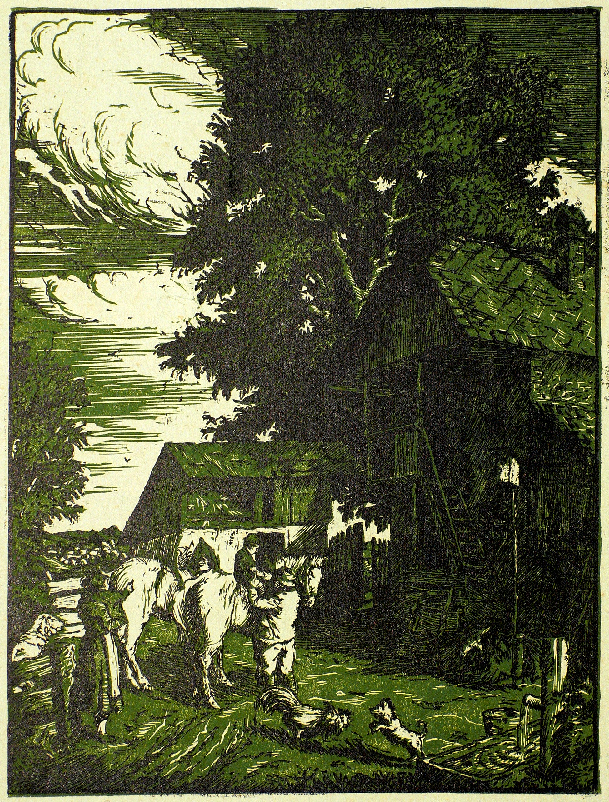 Nicht handsigniert. Verso in Bleistift bezeichnet. – Blick auf einen Bauernhof. Zur Rechten die Gebäude. Im Vordergrund die Bauersleute und zwei Pferde. Vater lässt seinen kleinen Sohn auf dem Pferd sitzen. Im Vordergrund streiten sich Hahn und Hund. – Im Blatt unten kleiner Einriss. Sonst gut erhalten.