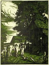 Um 1940. Farbholzschnitt / Clair-obscure, in Grün & Schwarz, auf hellgelbem Velin. – Originale Künstlergrafik, von Alfred Pilz. – 39,5 x 29,8 cm (Darstellung / Tonplatte), 47 x 34 cm (Blatt).