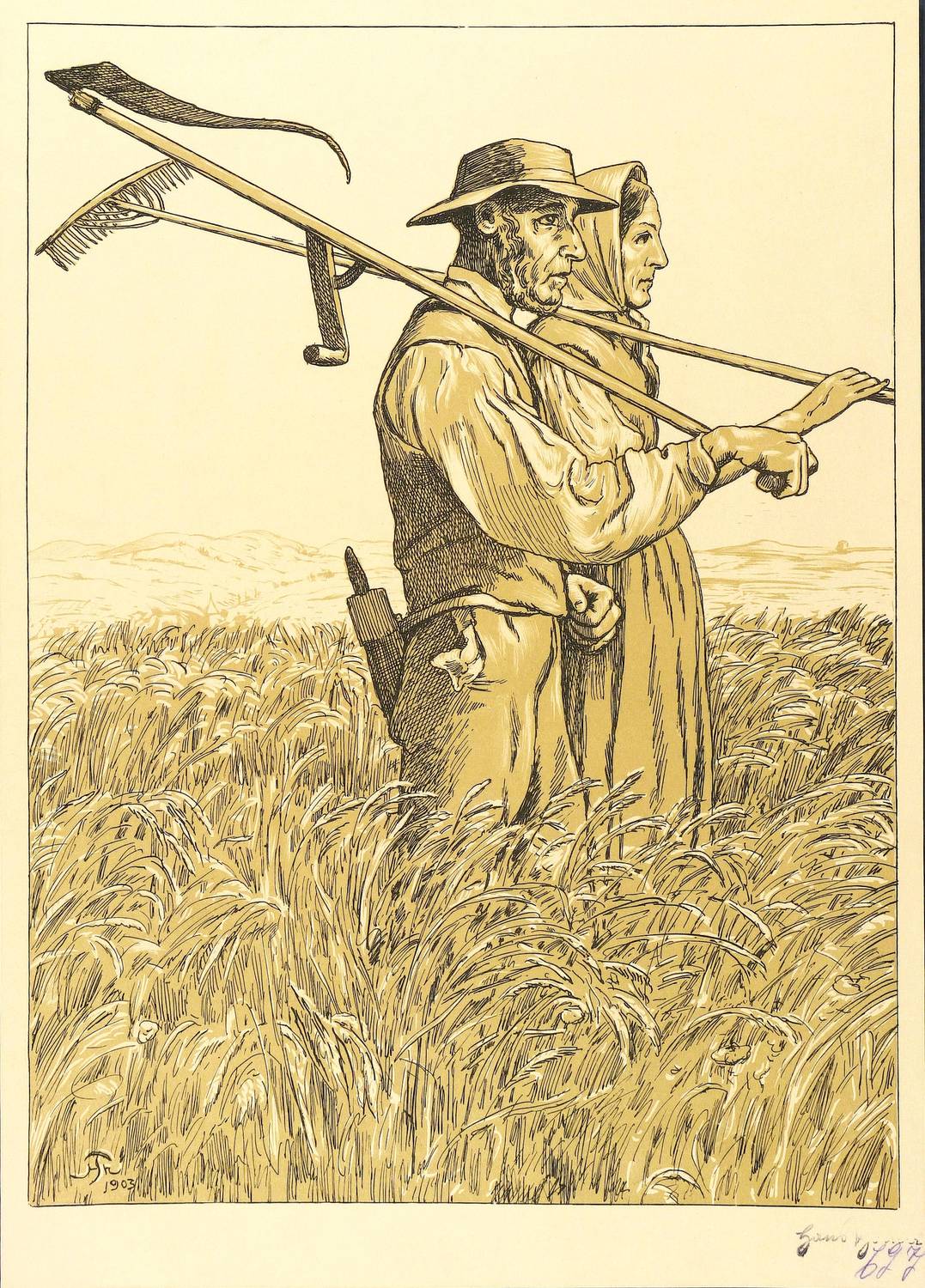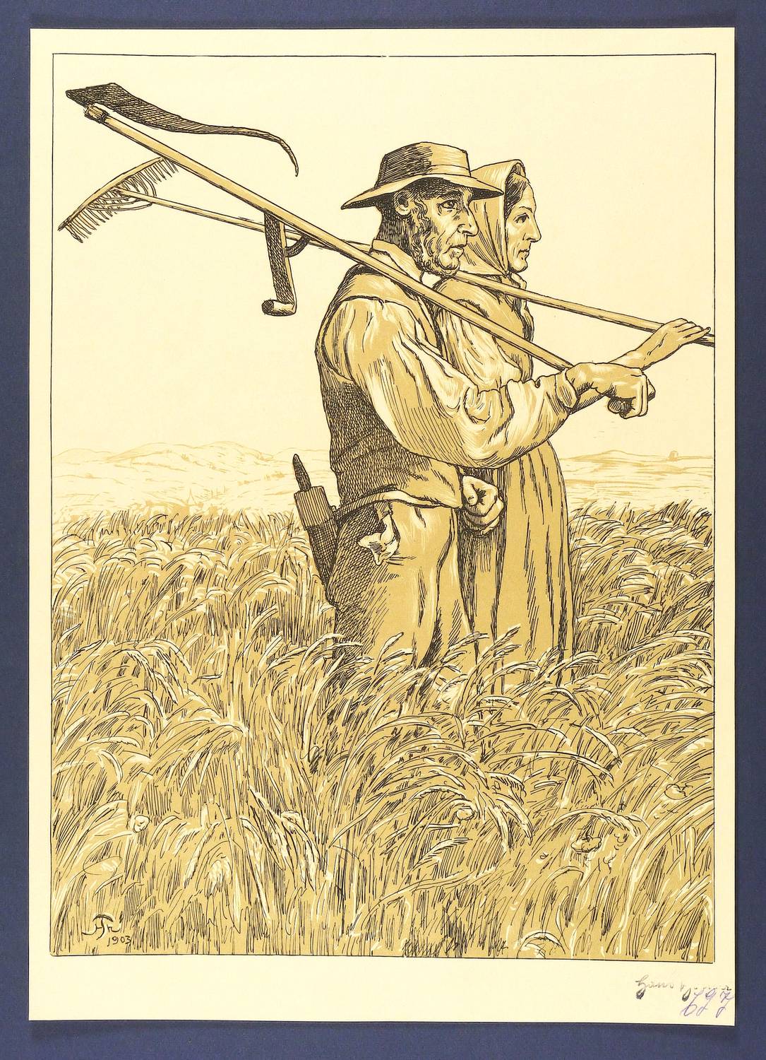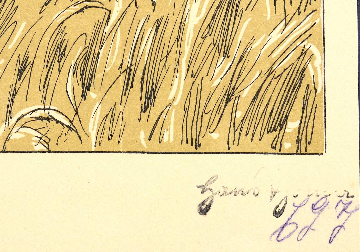 1903. Farblithografie / Kreide- & Federlithografie, in Ocker & Schwarz, auf hellgelbem Büttenkarton. – Originale Künstlergrafik, von Hans Thoma. – 49,7 x 36,7 cm (Darstellung / Einfassungslinie), 55 x 39 cm (Blatt).