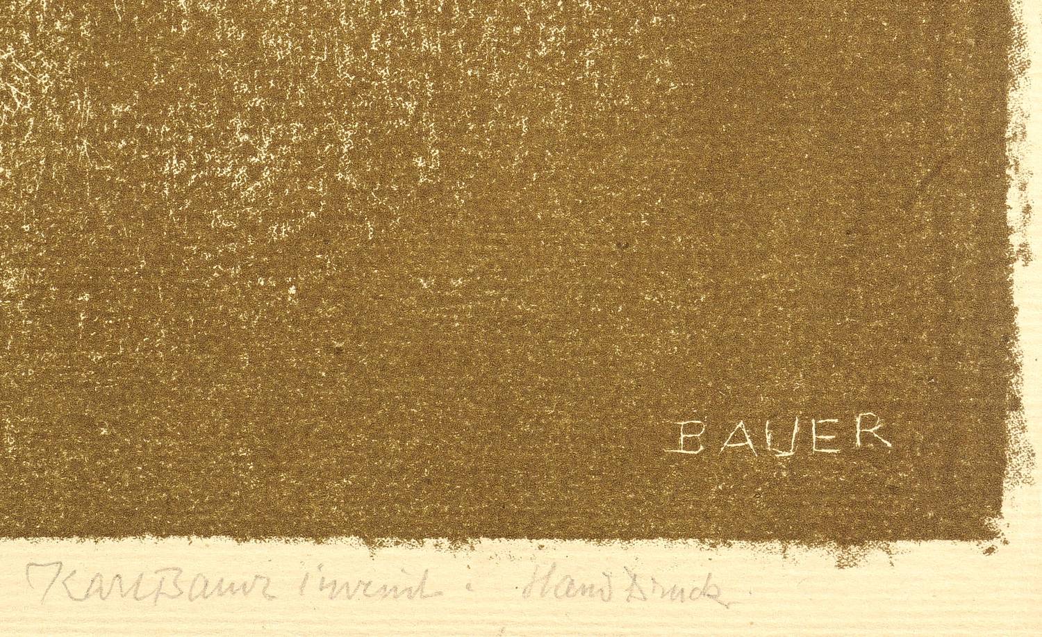 Rechts unten in Bleistift signiert: ″Karl Bauer invenit Handdruck.″ Links Titel. Verso Stempel der Kunstdruckerei Künstlerbund Karlsruhe (KKK) mit der handschriftlichen Katalognummer ″105″. – Bei leichten Randmängeln insgesamt gut erhalten.