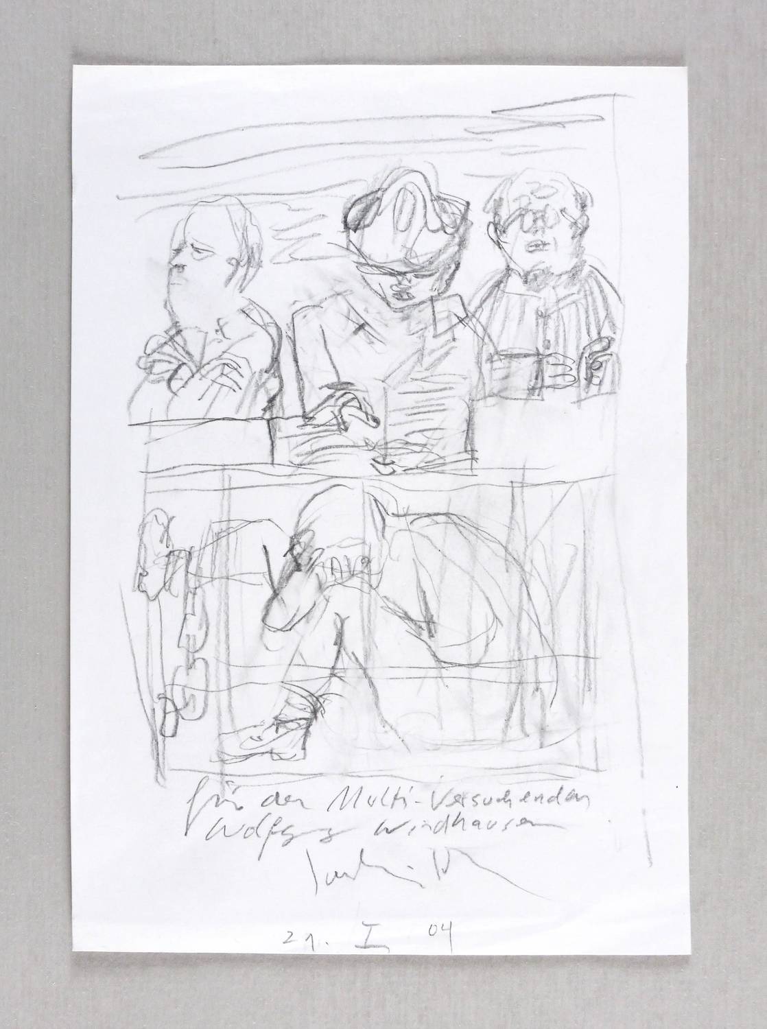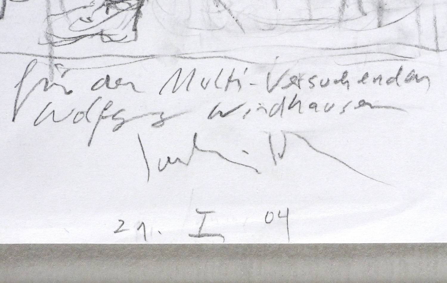 Unterhalb in Bleistift bezeichnet, signiert und datiert: ″für den Multi- Versuchenden Wolfgang Windhausen / Joachim John / 21.I.04″. UnterVerso weiter: ″zu Volker Brauns Erzählung 'Der berüchtigte Christian Sporn' (erscheint bei Pirckheimer Leipzig als Bibliophiles und im Herbst als Inselbuch) J.″ – Papier etwas griff- und knickspurig. Guter Zustand.