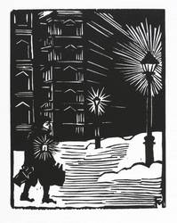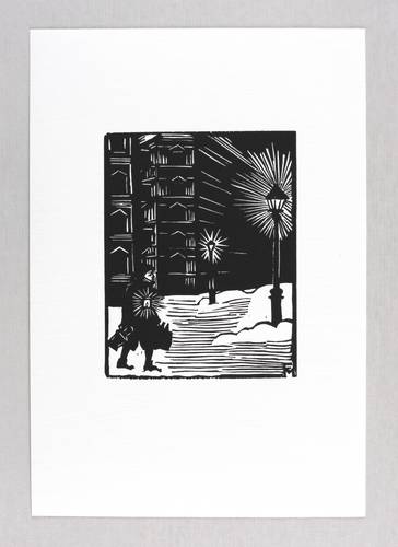 Söhn 521. – Nicht handsigniert. Im Druckstock rechts unten Monogramm: ″FM″. Verso typografisch bezeichnet: ″Conrad Felixmüller, Milchaustragen in den Morgenstunden, 1968 / Abzug vom Holzstock 1990″. – Posthumer Abzug vom originalen Druckstock von 1990. – Ohne Tadel. Sehr gut erhalten.
