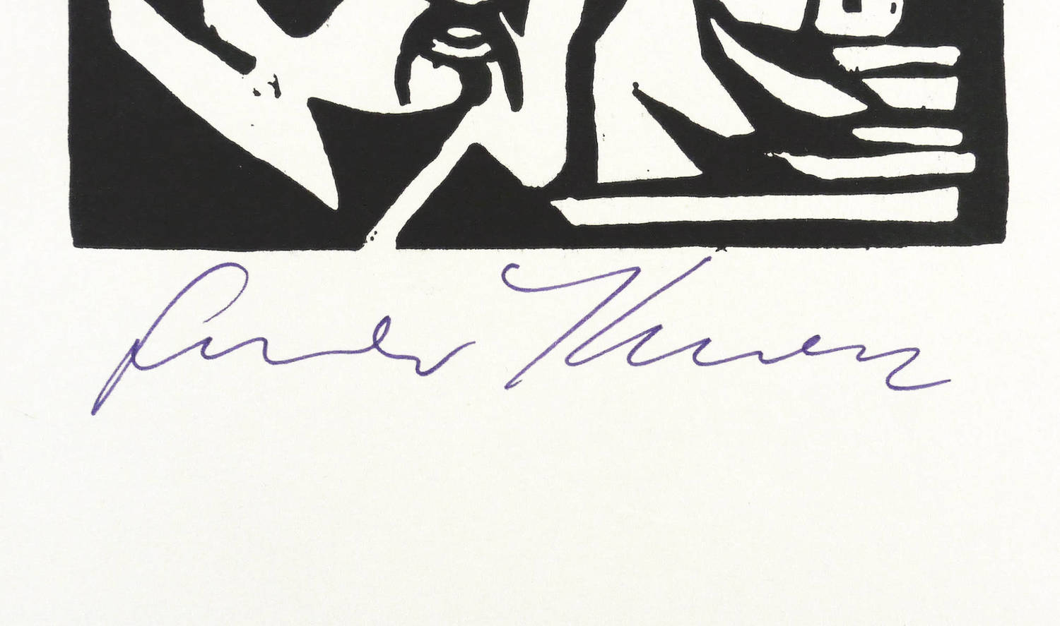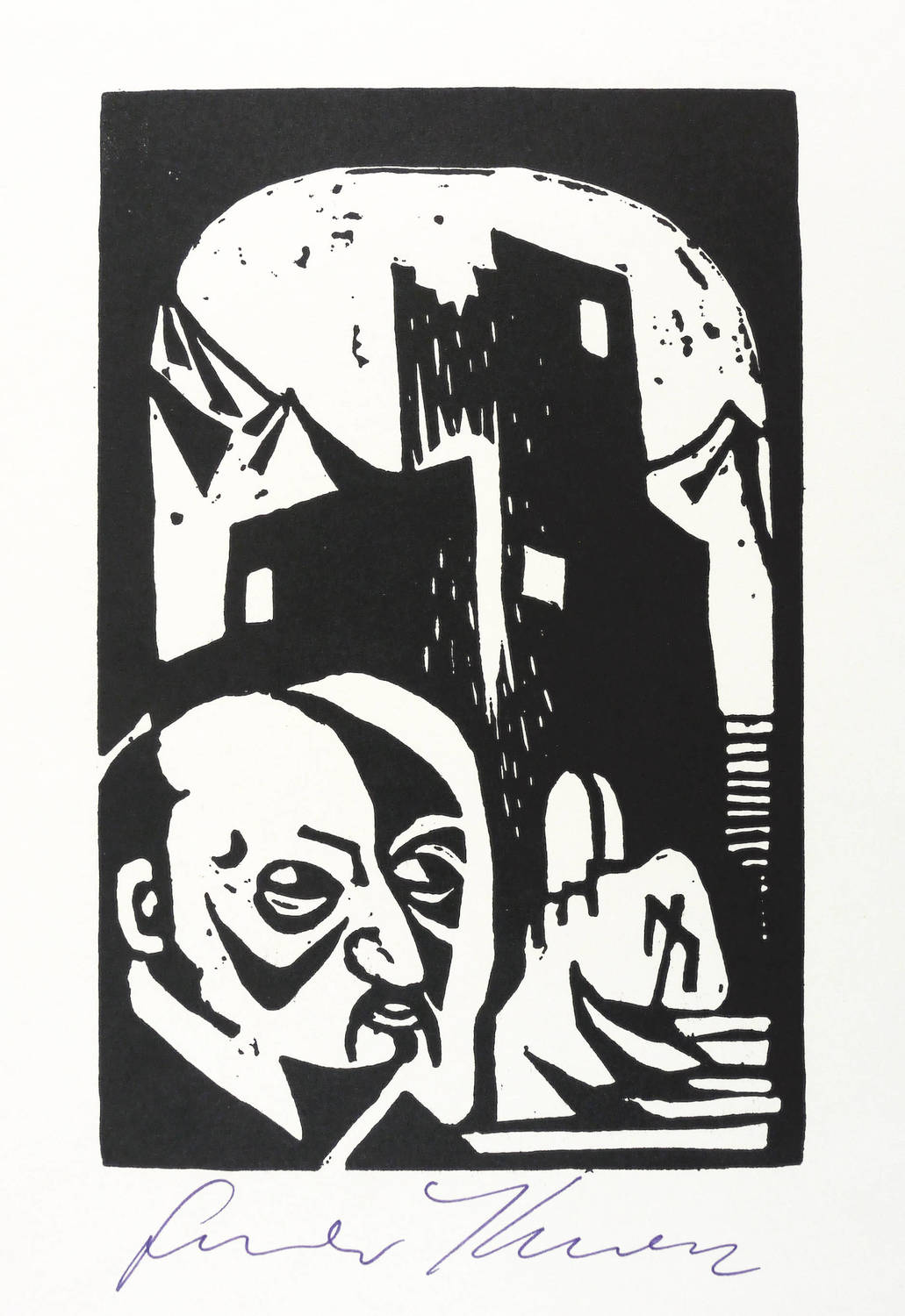 Unterhalb mit Faserstift signiert: ″Günter Kunert″. – Dieser Linolschnitt fand Verwendung für die Einbandgestaltung des Buches: Günter Kunert, Begleitheft zur Ausstellung der Stadt- und Universitätsbibliothek, Frankfurt am Main: Stadt- und Universitätsbibliothek 1981). - Signatur wohl später. – Sehr guter Zustand.