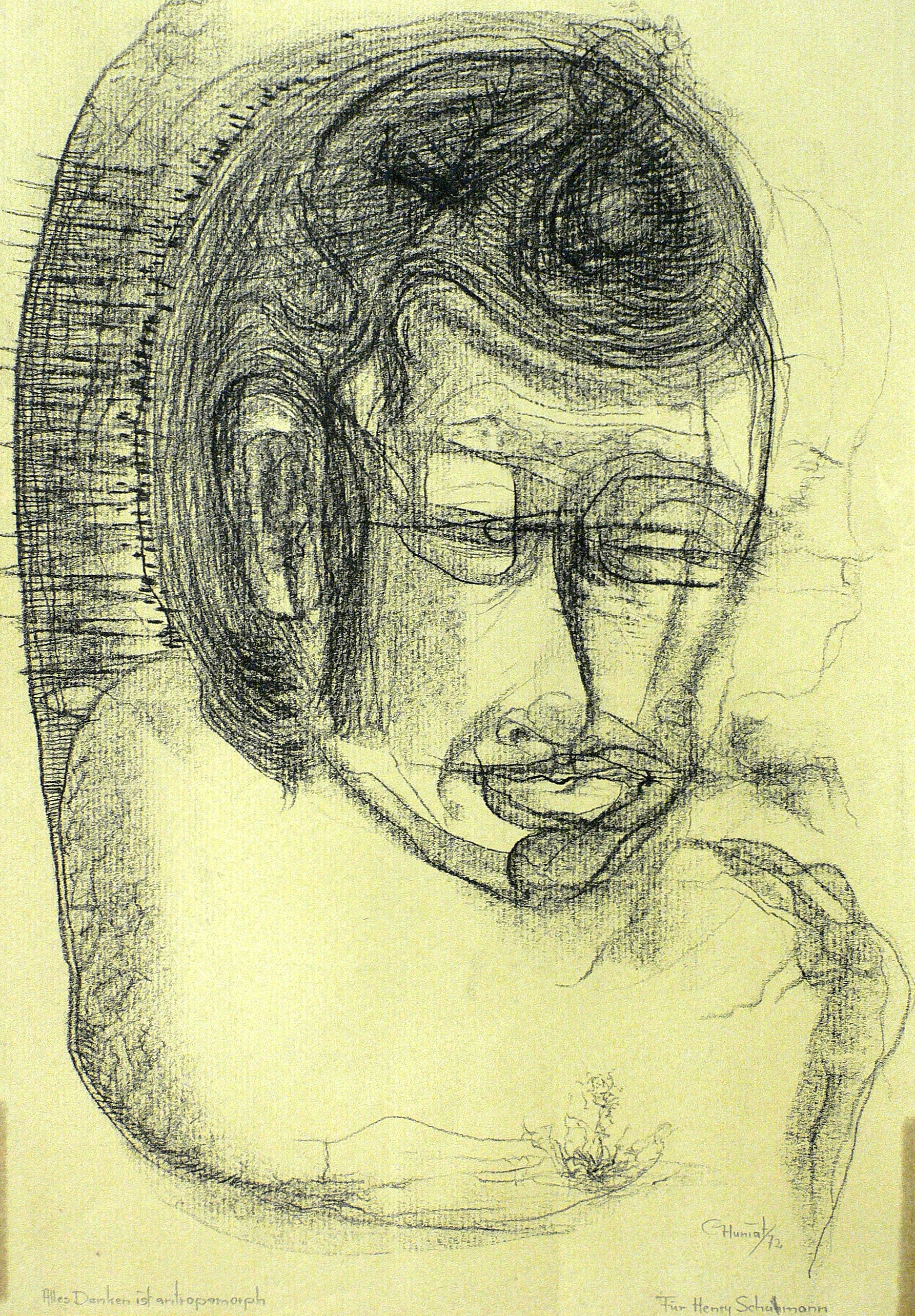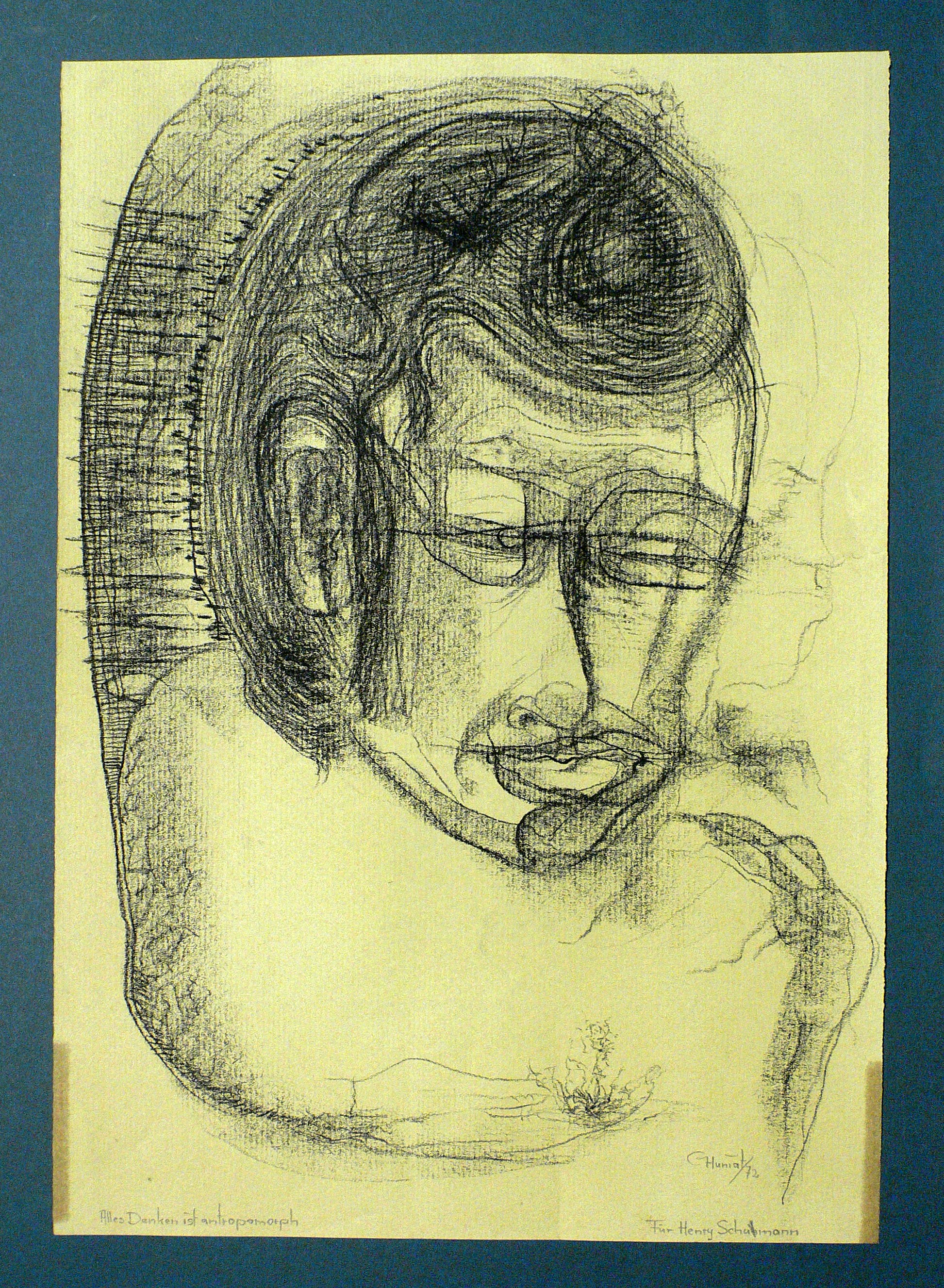 1972. Zeichnung / Kohlezeichnung, in Schwarz auf bräunlichem Papier. – Originale Künstlergrafik, von Günther Huniat. – Unikat. – 36,0 x 25,5 cm (Darstellung / Einfassungslinie).