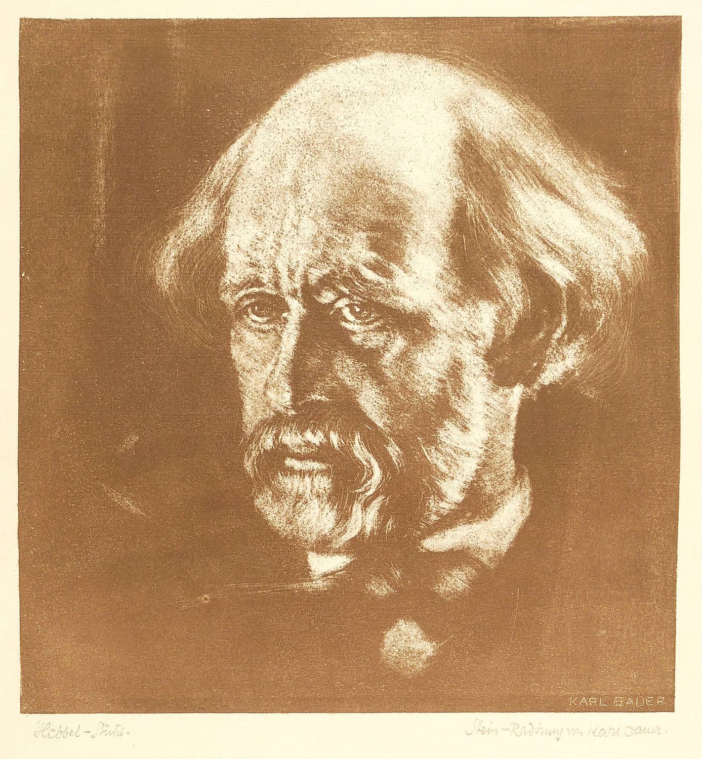 Karl Bauer (1868 Stuttgart - 1942 München). Deutscher Grafiker, Maler und Schriftsteller. Ab 1888 an der Kunstakademie Stuttgart und an der Akademie der Bildenden Künste München u.a. bei Wilhelm von Lindenschmit. Studienreisen nach Italien und Frankreich. 1891 Bekanntschaft mit Stefan George in Venedig und Fertigung des berühmten Porträts desselben. 1893 in Paris. Nach 1896 in München als Illustrator. Ab 1903 verstärkt Hinwendung zur Bildniskunst, ausgehend von seiner vertieften Beschäftigung mit Goethe und dessen Physiognomie. 1908 erscheint im Mittler-Verlag in Berlin seine illustrierte Abhandlung "Goethes Kopf und Gestalt". 1927 Teilnahme an der Münchener Kunstausstellung im Glaspalast. Neben seinen Gedichten verfasste Bauer zahlreiche Abhandlungen über Geschichte, Literatur und Religion. Als Maler spezialisierte er sich auf Lutherporträts, so für die Kirchen in Görlitz, Oppenweiler und Helsinki. Neben Porträts berühmter Zeitgenossen, wie George und Vollmoeller, fertigte Bauer zahlreiche Porträts historischer Persönlichkeiten, die immer auch den Anspruch bildlicher Charakterstudien von Person und Werk haben. 1930 zog er von München zurück nach Stuttgart, wo er oberhalb der Stadt in Sillenbuch lebte und arbeitete. 1932 beteiligte er sich einmalig an der 7. Stuttgarter Sezession mit dem Bildnis seiner Schwester. Teilnahme an der Ausstellung Juryfreie Künstlervereinigung Stuttgart.