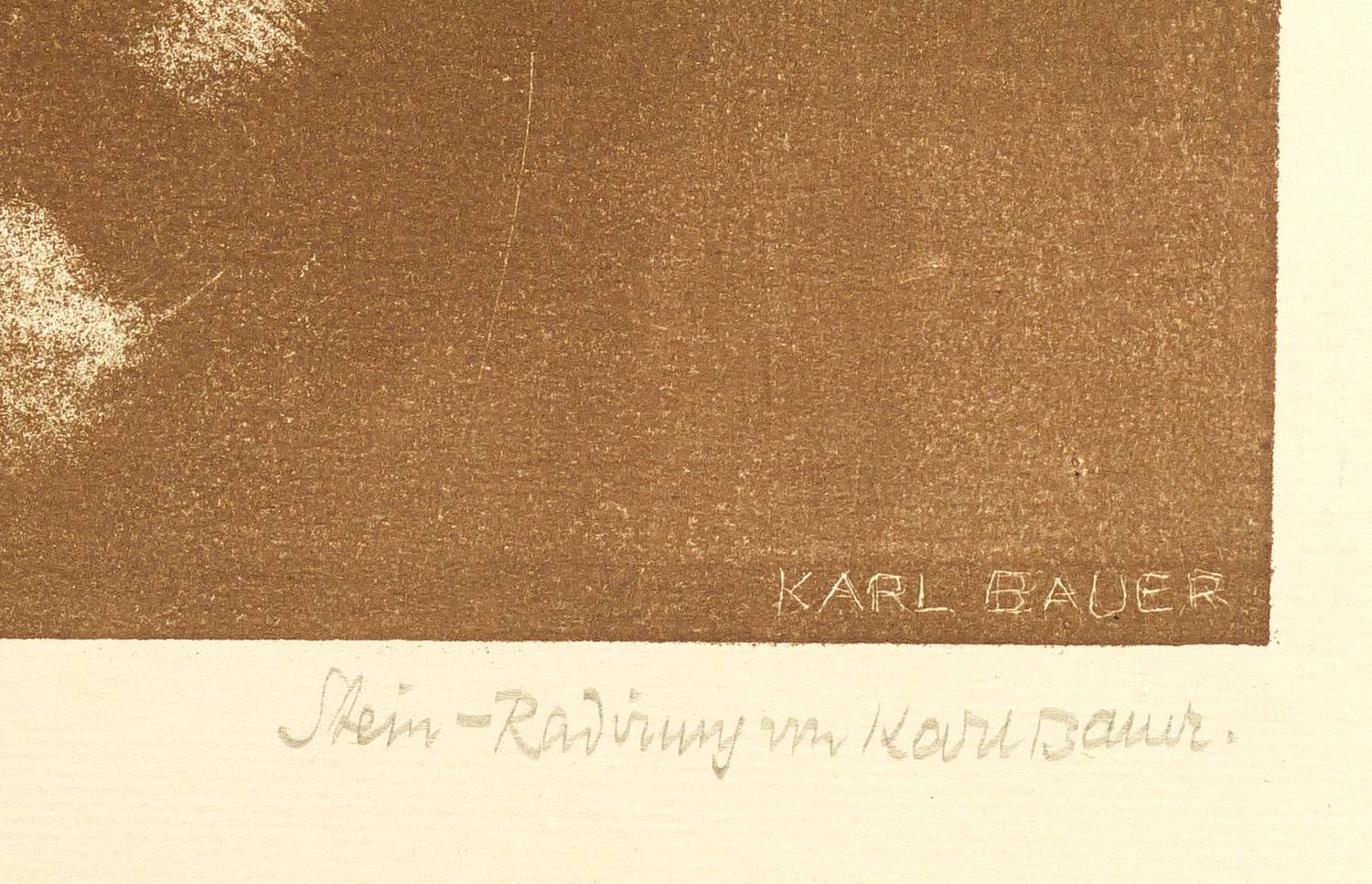Im Stein rechts unten signiert: ″KARL BAUER″. Rechts unten in Bleistift bezeichnet: ″Stein-Radirung von Karl Bauer″. Links Titel. Verso Stempel der Kunstdruckerei Künstlerbund Karlsruhe (KKK) mit handschriftlicher Katalognummer ″104″. – Im breiten Rand unscheinbare Lagerspuren. Insgesamt gut erhalten.