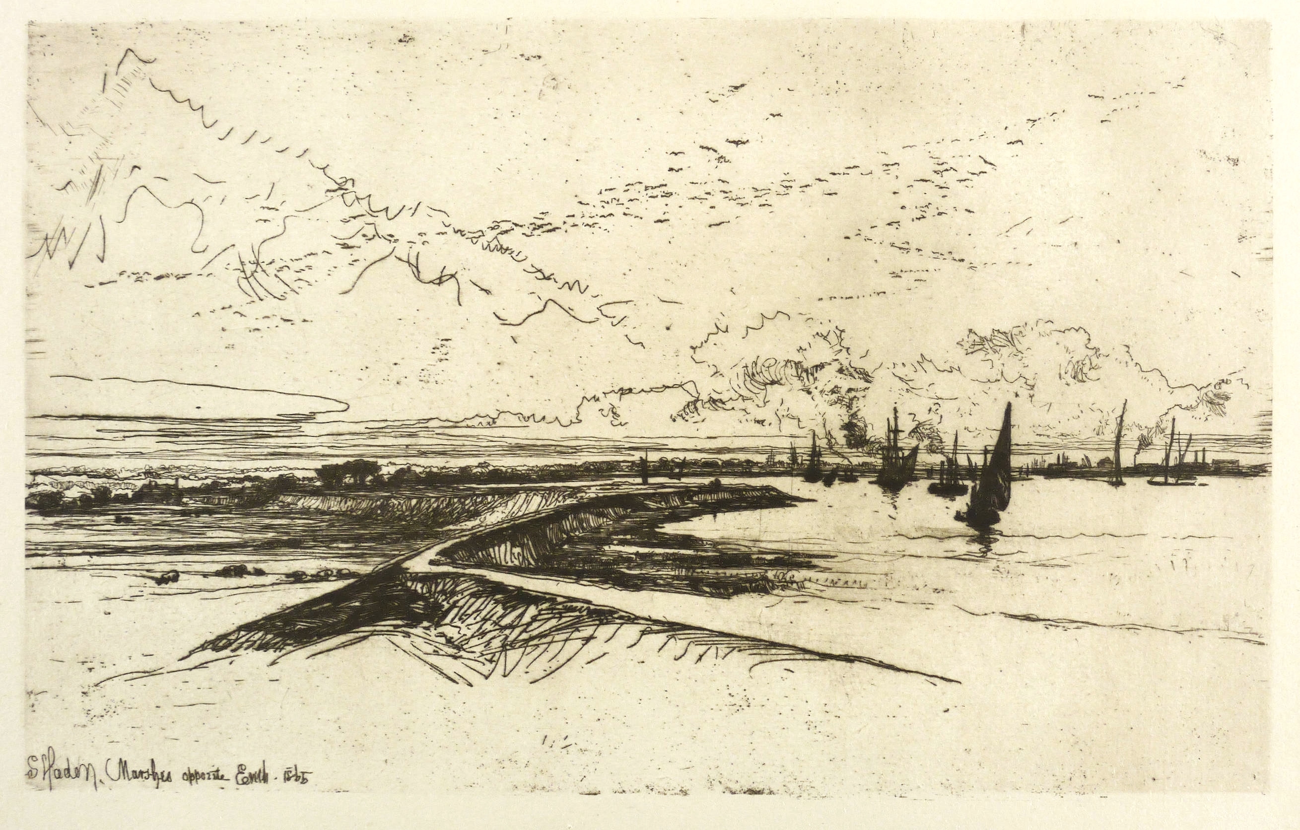 Schneidermann 104 V. Harrington 113 III. – Aus: Die Graphischen Künste (Wien: Gesellschaft für Vervielfältigende Kunst 1887), Bd. 10. – Nicht handsigniert. In der Platte links unten signiert und datiert: ″S. Haden. Marshes opposite Erith. 1865″. Dazu mittig bezeichnet: ″ORIGINAL- RADIRUNG VON F. SEYMOUR HADEN″. – Radierplatte aus dem Jahr 1865, gedruckt 1887 für die Gesellschaft für vervielfältigende Kunst Wien. – Situation am Nordufer der unteren Themse, etwa zwölf Meilen östlich von London, gegenüber von Purfleet. – Sehr guter Zustand.