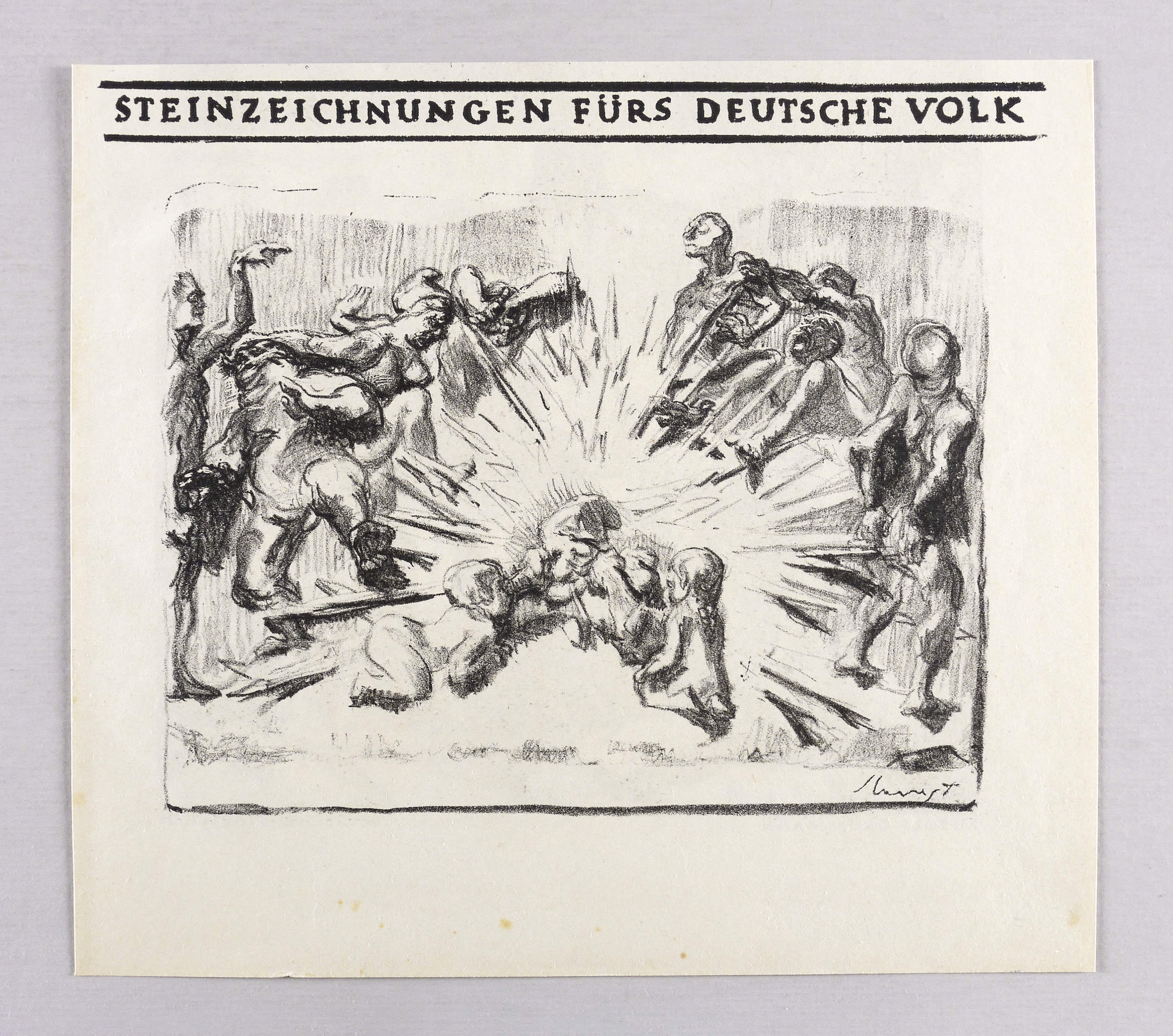 Söhn 26. – Aus: Der Bildermann. Steinzeichnungen fürs deutsche Volk (Berlin: Paul Cassirer 1916). – Nicht handsigniert. Im Stein rechts unten signiert: ″Slevogt″. Oberhalb typografisch bezeichnet: ″STEINZEICHNUNGEN FÜRS DEUTSCHE VOLK″. – Verso oben beschnittene Lithografie von Rudolf Grossmann ″Deutsches Städtchen″. – Guter Zustand.